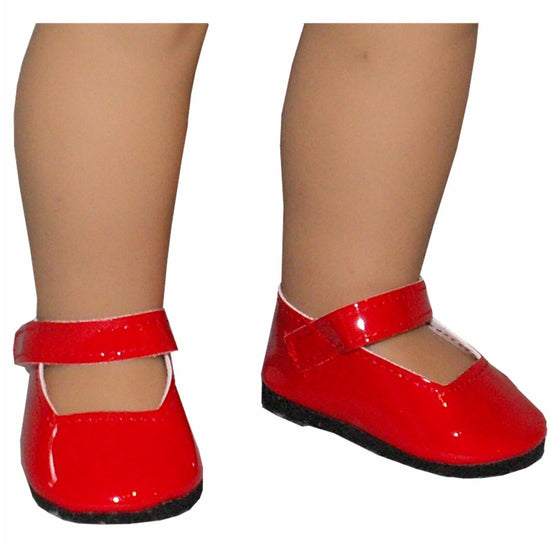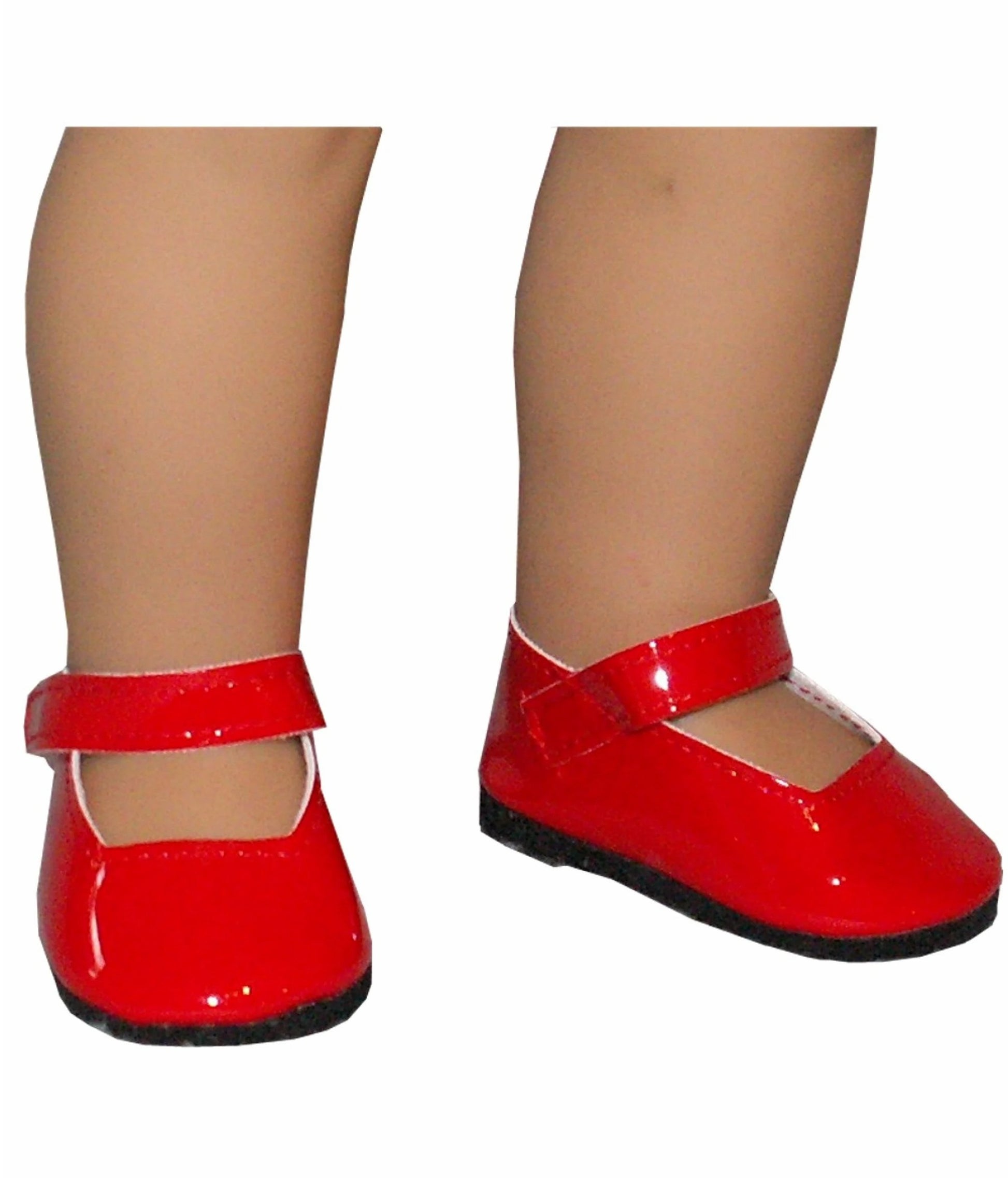 Red faux patent leather Mary Jane dress shoes close with Velcro.