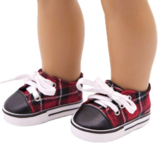 Rock a timeless look with these classic red and black plaid canvas sneakers, complete with authentic laces for that perfect sporty vibe. Designed to fit American Girl dolls, these sneakers are ideal for casual outfits, outdoor adventures, or everyday doll styling. The bold plaid pattern pairs effortlessly with any wardrobe, giving your doll that cool, put-together aesthetic she's been waiting for.