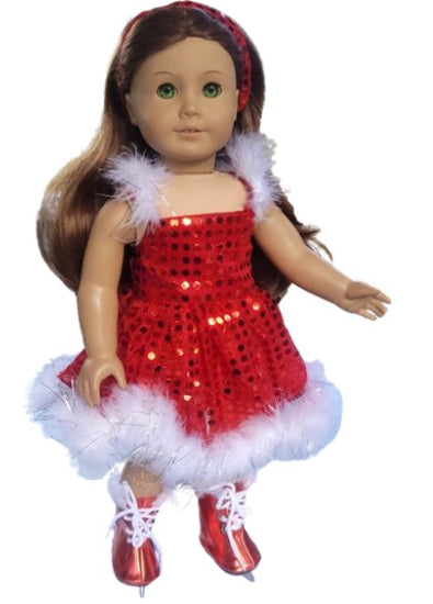 Bring sparkle and fun to your doll’s wardrobe with this red skating dress. Its shimmering fabric shines bright, while the fluffy white boa trim adds a whimsical touch. Complete with a matching headband and panties, this outfit lets your doll skate into style with playful charm. Perfect for dress-up adventures full of flair!