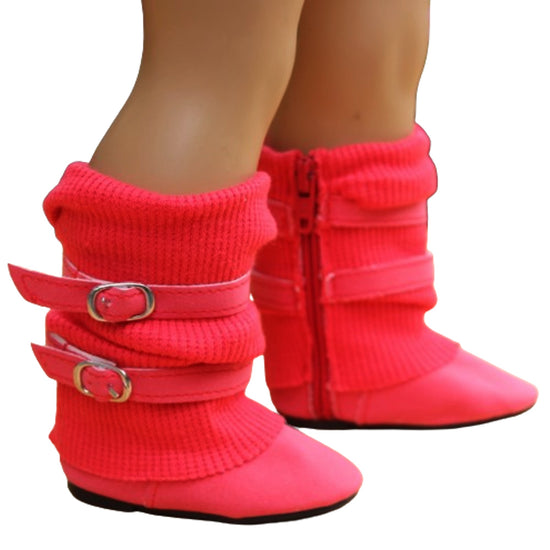 Light red slouchy doll boots feature decorative buckles and convenient zipper closures for easy dressing. Their soft, relaxed style adds flair to your American Girl doll’s outfit. Perfect for adding a bold pop of color to any look.