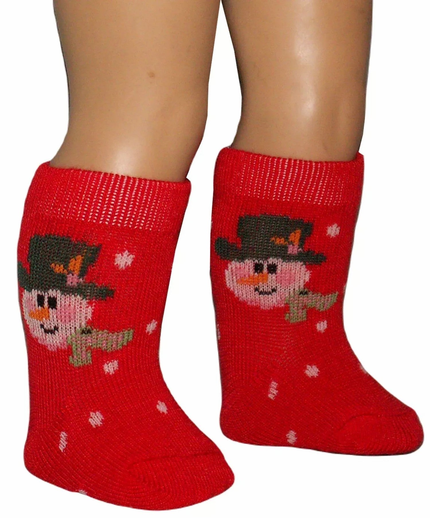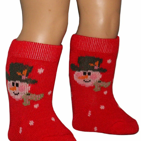 Red Christmas snowman knee high socks fit most dolls 15-21" with average size feet.