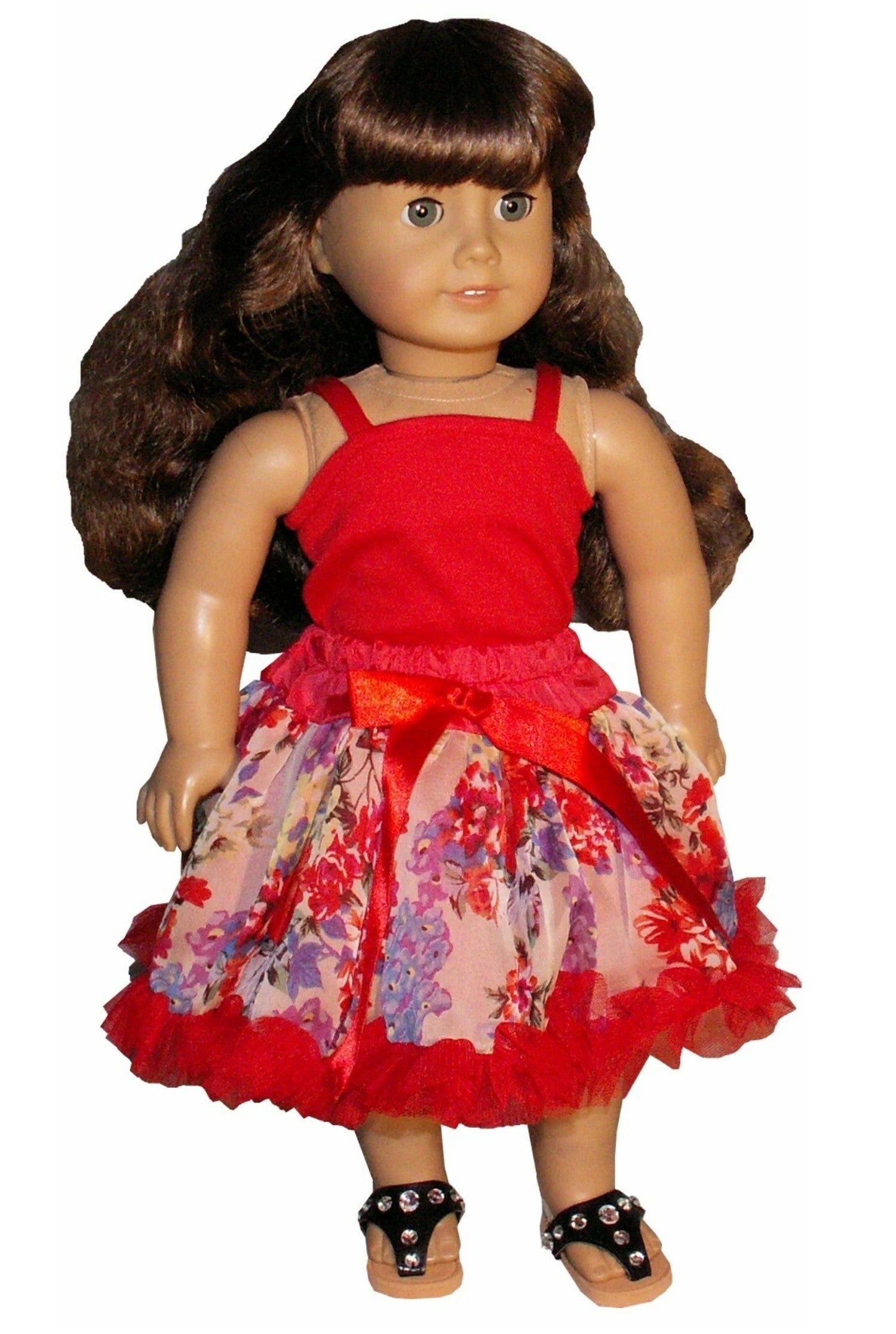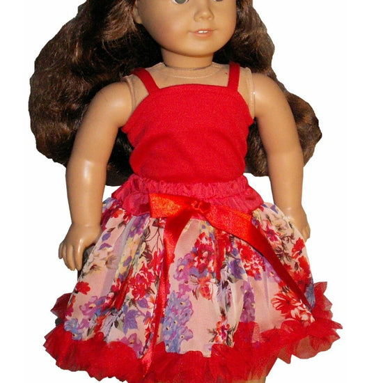 Twirl into celebration with this vibrant red tank paired with a flowing floral chiffon skirt! Perfectly sized for 18-inch American Girl dolls, this festive two-piece combo brings Mardi Gras magic to playtime. The classic red tank provides a bold contrast to the delicate floral print, creating an outfit that's ready for parades, parties, or everyday adventures. Your doll will love the graceful movement of the full skirt as she dances through imaginative play.