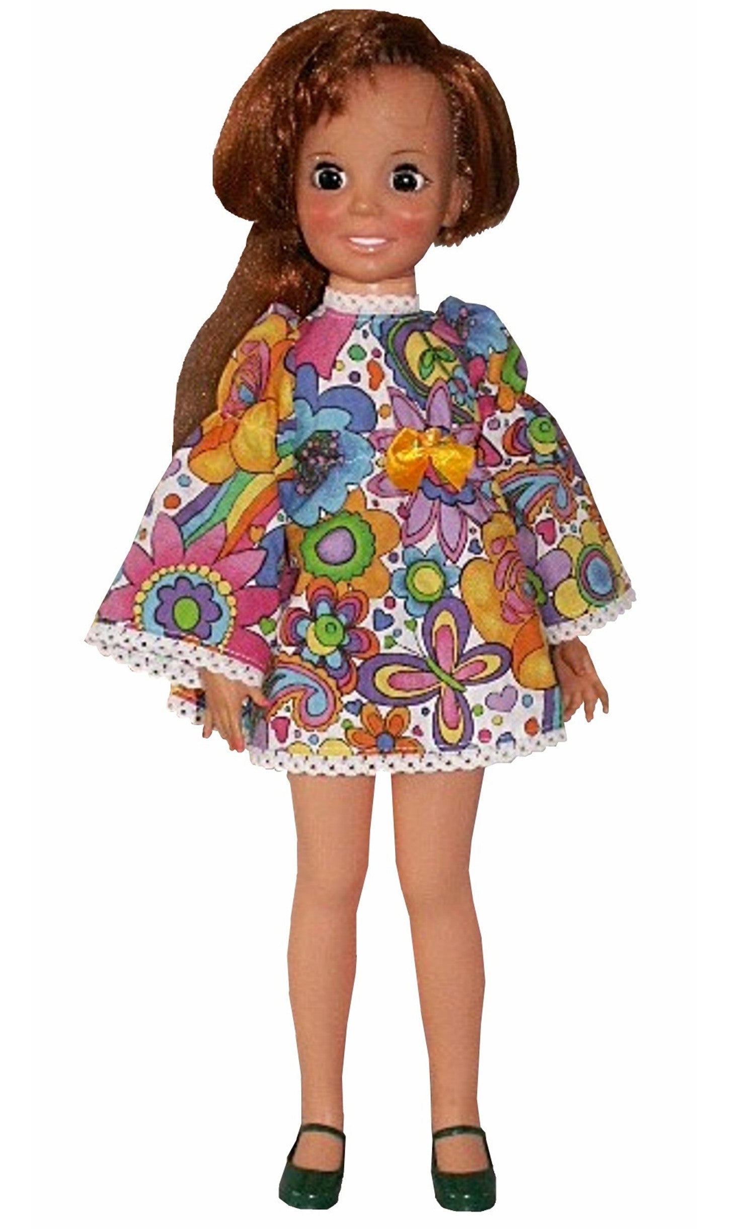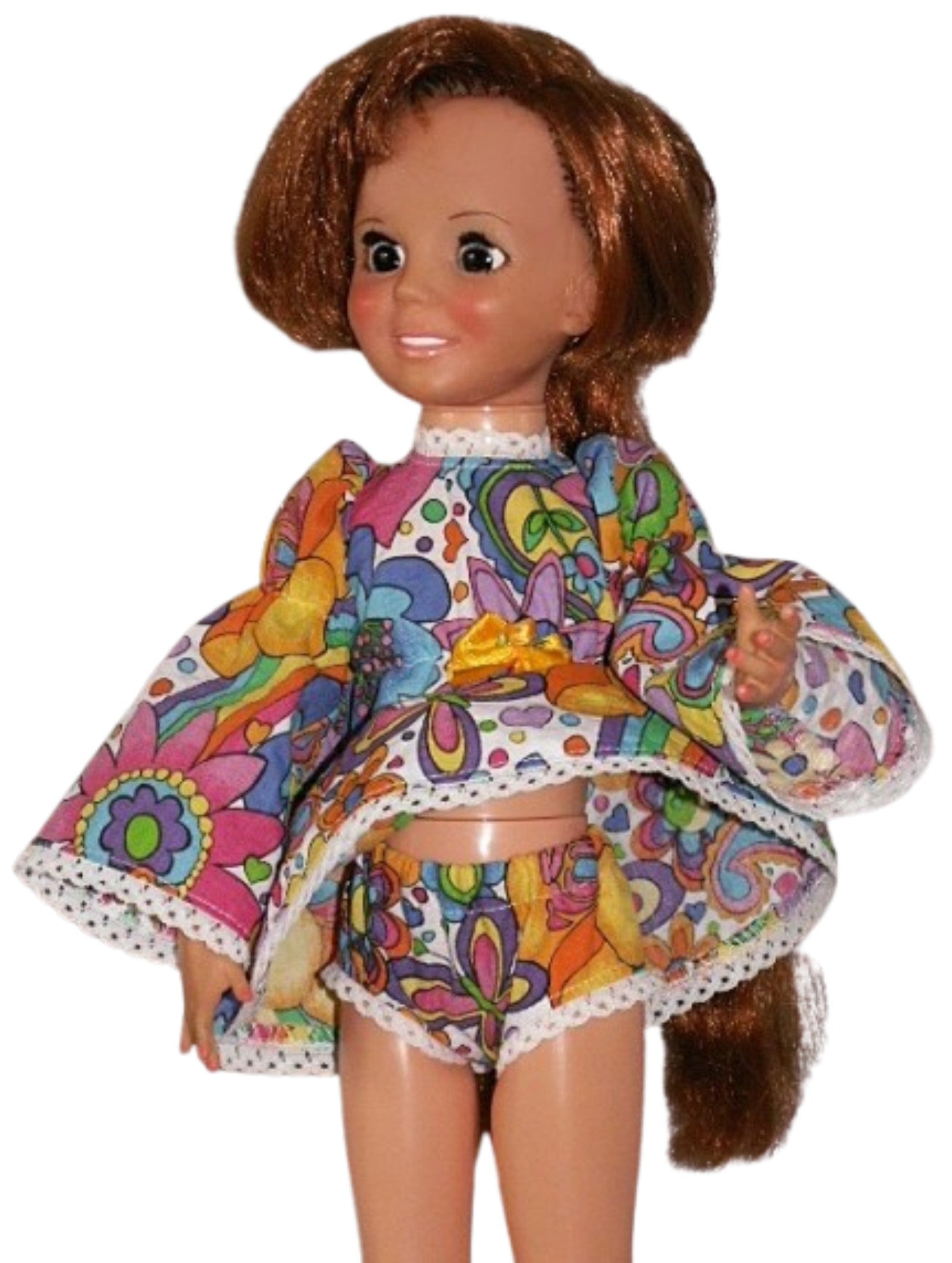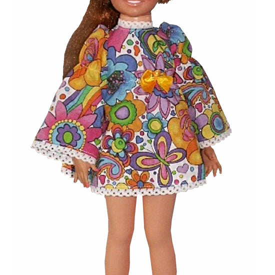 Step back in time with this groovy retro dress for your 18-inch Crissy doll! A matching pair of panties (optional) feature delicate lace edging for vintage charm. Easy back Velcro closure means your doll stays dressed through all her stylish adventures. Perfect for recreating classic doll fashion moments or creating fun throwback looks!