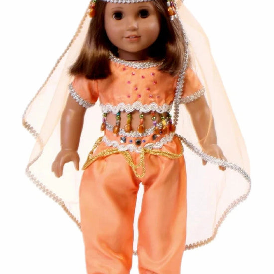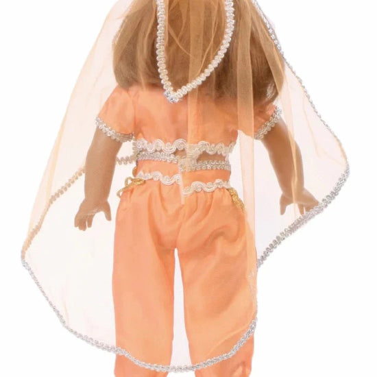 Let your 18-inch American Girl doll become a magical genie with this enchanting salmon orange costume! The set features flowing, shimmering fabrics in vibrant hues that capture all the wonder of the beloved character. Cozy matching slippers complete the head-to-toe look, perfect for imaginative play, costume parties, or recreating favorite fairy tale adventures. Watch your doll transform into a mystical character ready to grant wishes and spark magical storytelling!