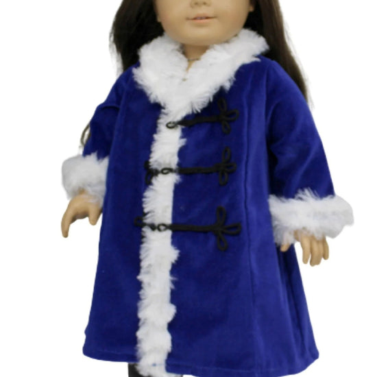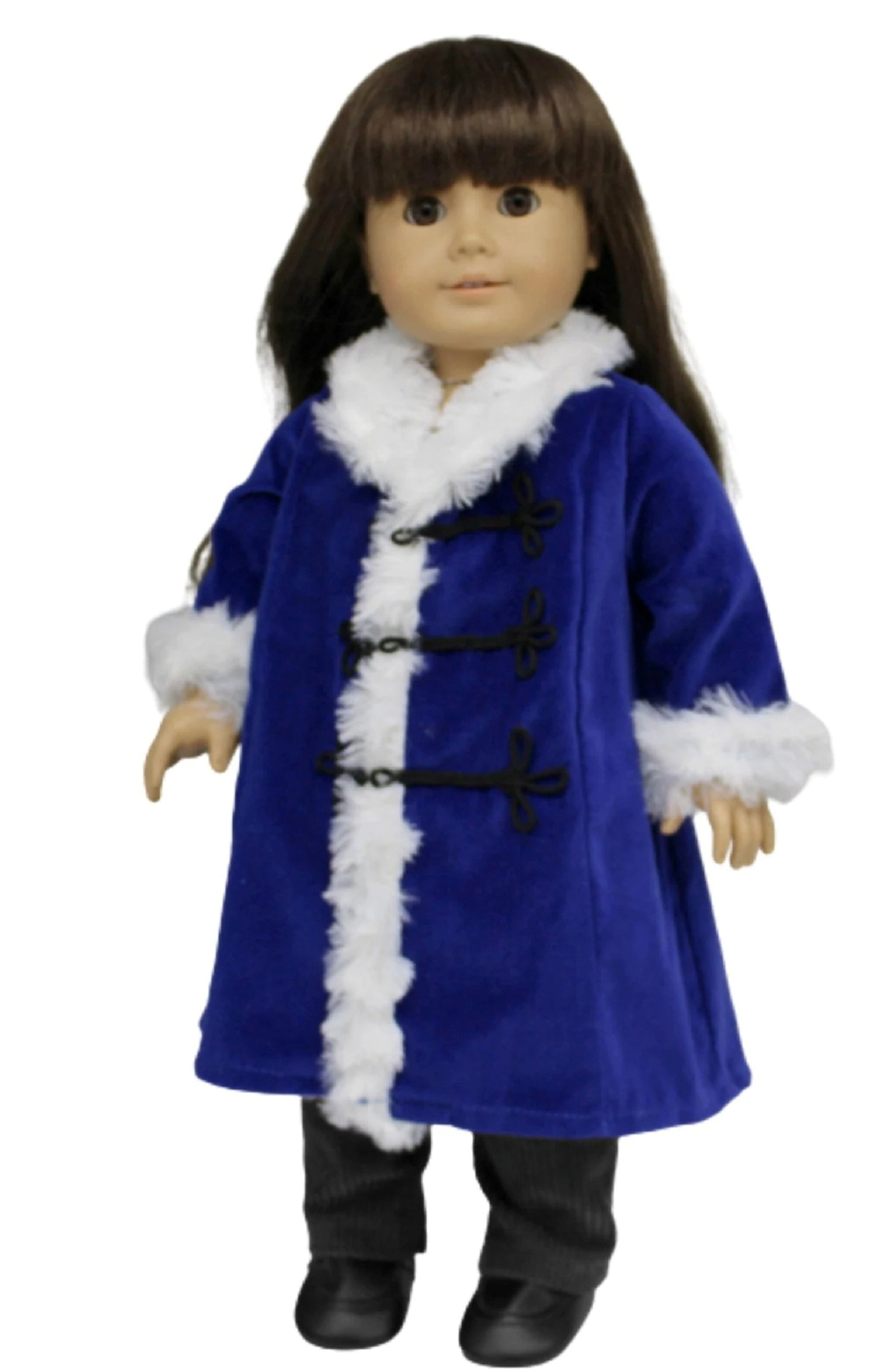 Samantha inspired blue velveteen coat with faux fur trim fits 18" American Girl® sized dolls. Coat has a frog toggle closure.