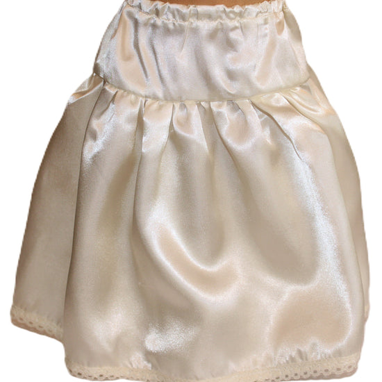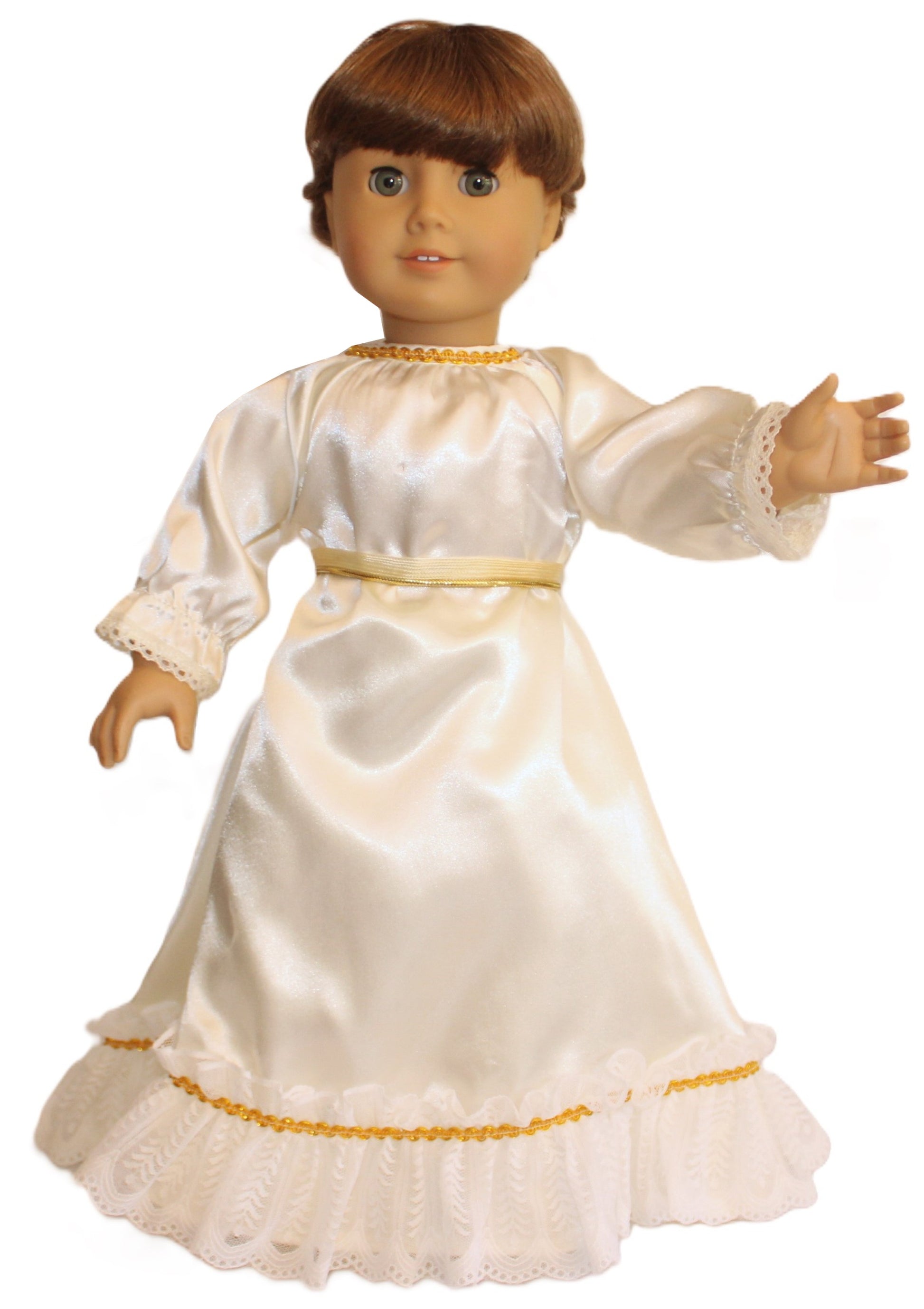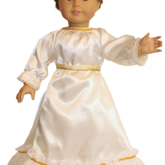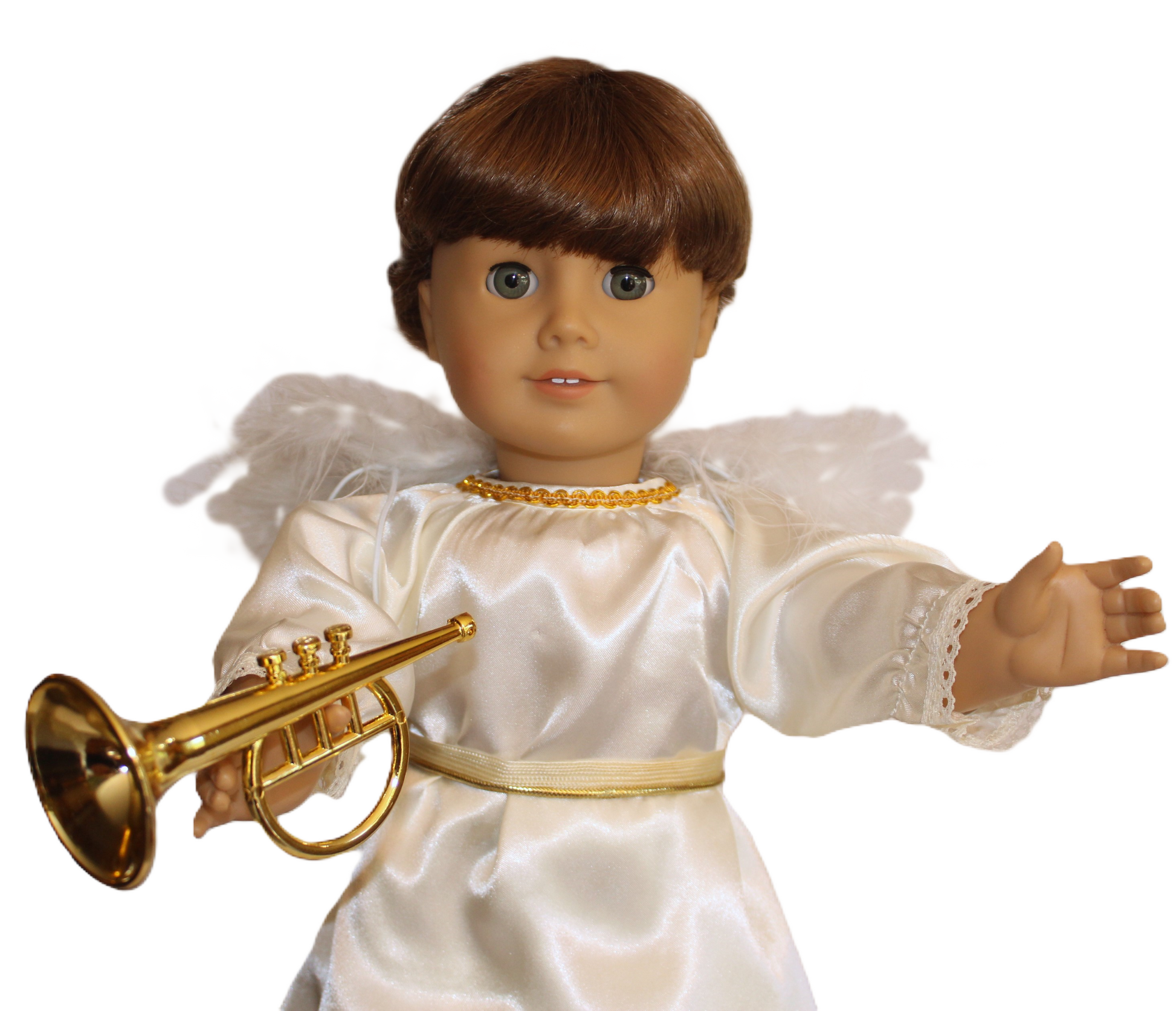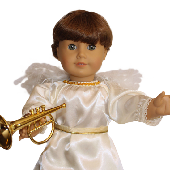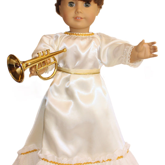 It includes a small 4 1/2" trumpet and an ivory satin underskirt, completing the angelic look for your doll.