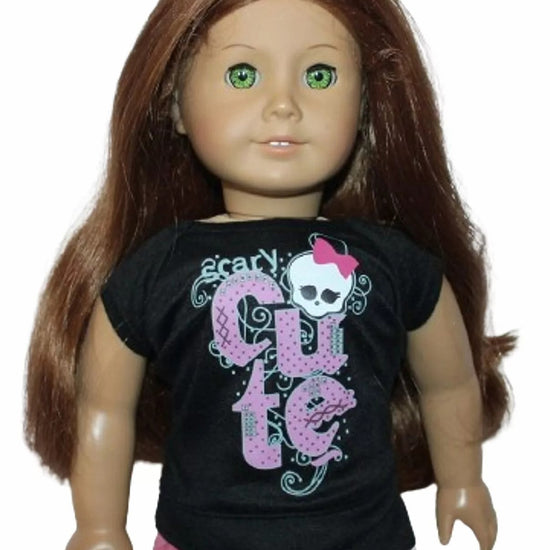 "Scary Cute" knit t-shirt with pink lace accent closes in back with Velcro.