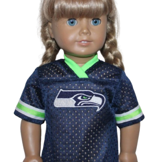 Dress your 18" American Girl doll in full team spirit with this playful Seattle Seahawks-inspired jersey. Featuring the iconic logo beautifully embroidered on the front, it’s perfect for game day fun or everyday adventures. Show off your favorite team's colors while adding a sporty touch to your doll’s wardrobe!