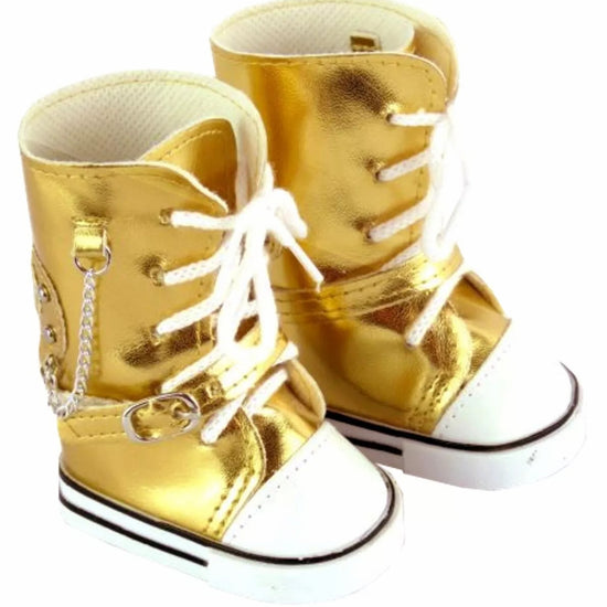 These shiny metallic gold high top sneakers feature decorative chains, adding a bold and stylish edge to your doll's outfit. Perfect for making a standout fashion statement with a touch of shimmer.