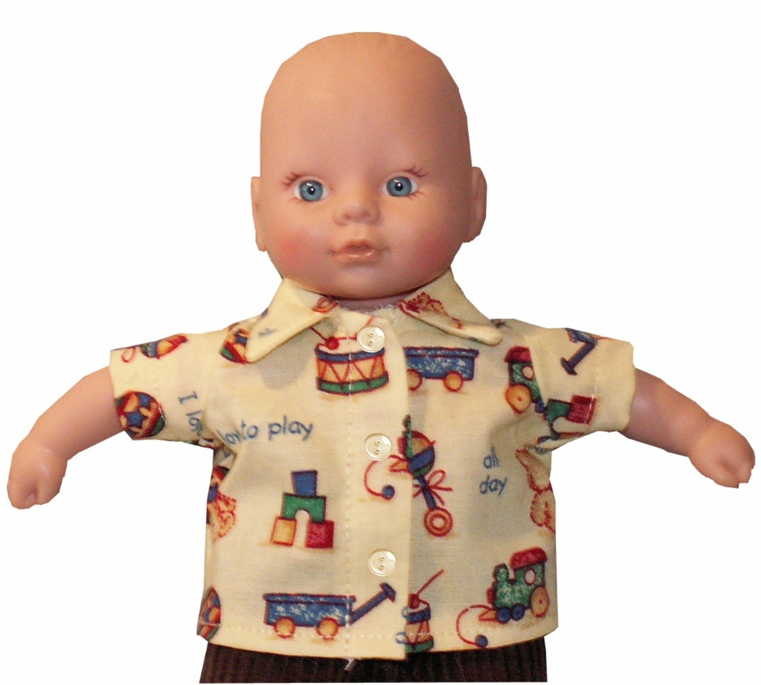 Dress your 8" Circo or Caring for Baby doll in adorable style with this charming shirt! Choose between short or long sleeves to match any season or outfit. Featuring a classic collar and decorative buttons that catch the light, this piece fastens securely with a convenient Velcro closure—perfect for little hands learning to dress their dolls. A wardrobe essential that brings joy to playtime.