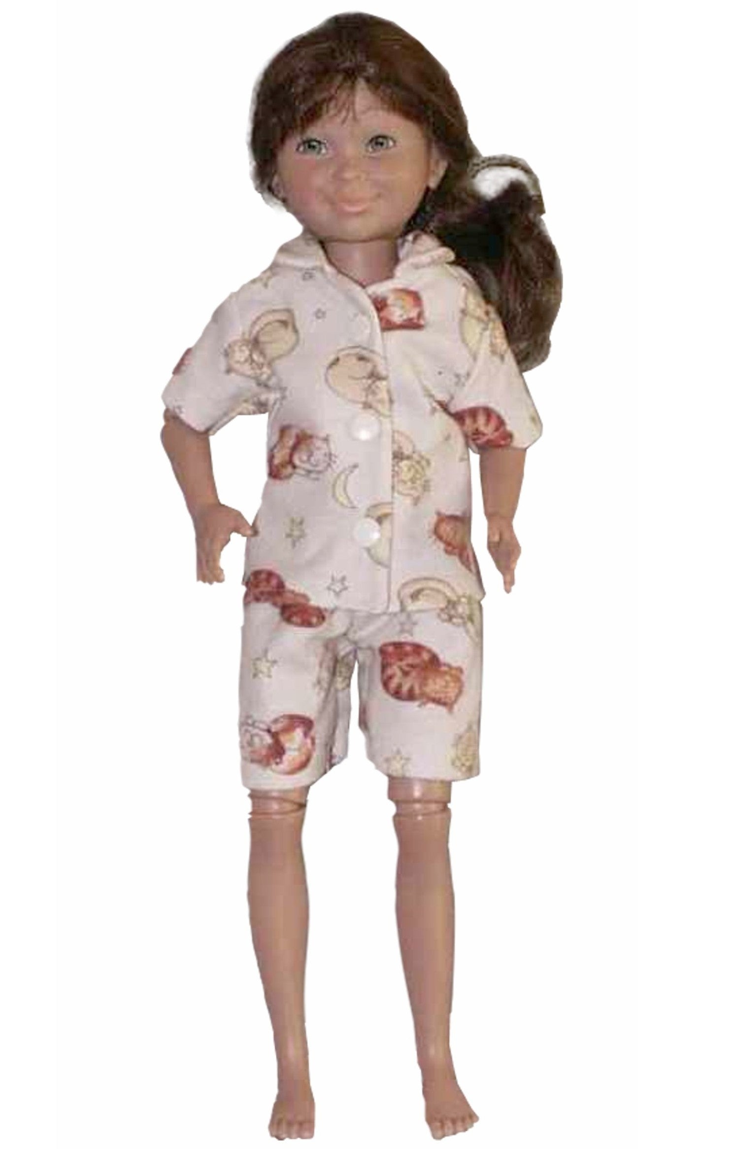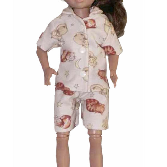 Cozy short pajamas designed for 16" Hopscotch Hill dolls. Features a collared top with short sleeves and matching shorts with an elastic waist for easy dressing. Perfect for bedtime play or casual loungewear in your doll's wardrobe.