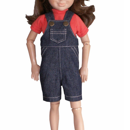 These short overalls for your 16" Hopscotch Hill doll bring a playful vibe with a handy front bib pocket, charming top-stitching, and shiny metal snaps that add extra flair and easy dressing for endless adventures!