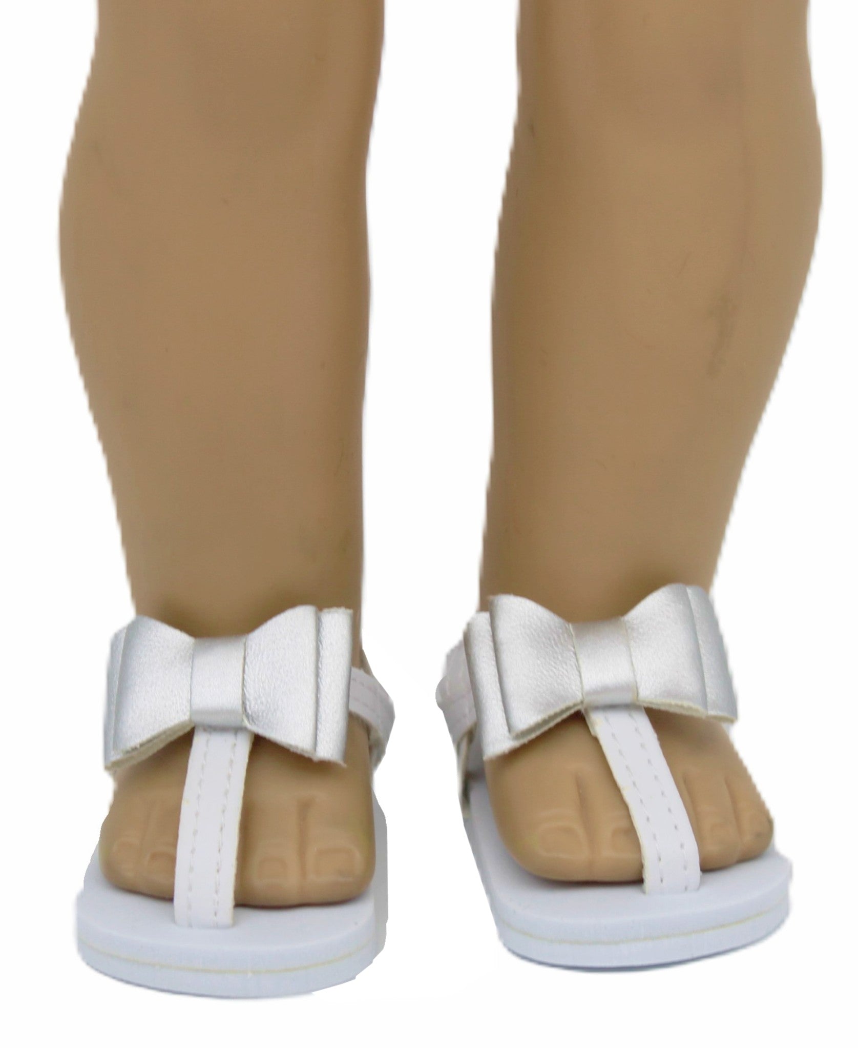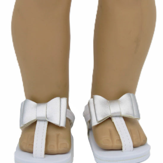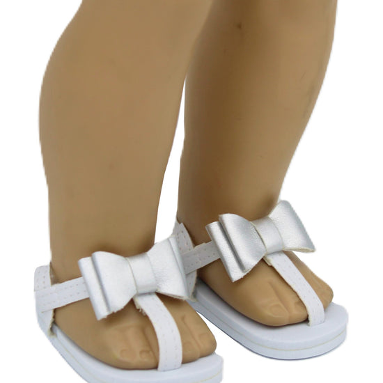 Give your doll a stylish sparkle with these Silver Bow on White Sandals! Featuring playful silver bows on classic white flip flops, they add a fun and fashionable touch to any doll outfit. Perfect for bright days and cheerful adventures, these sandals are both cute and comfy for endless doll fun.