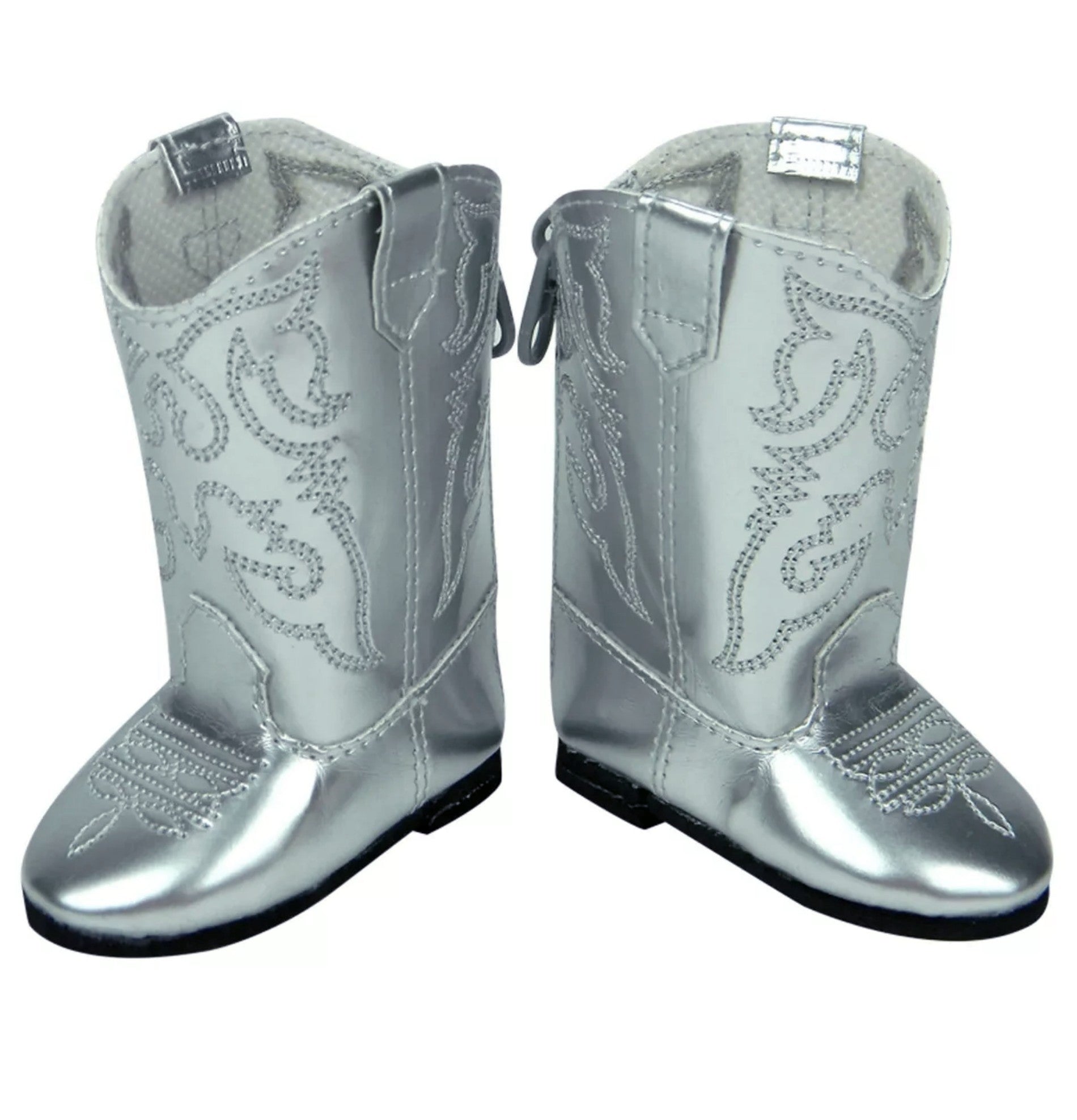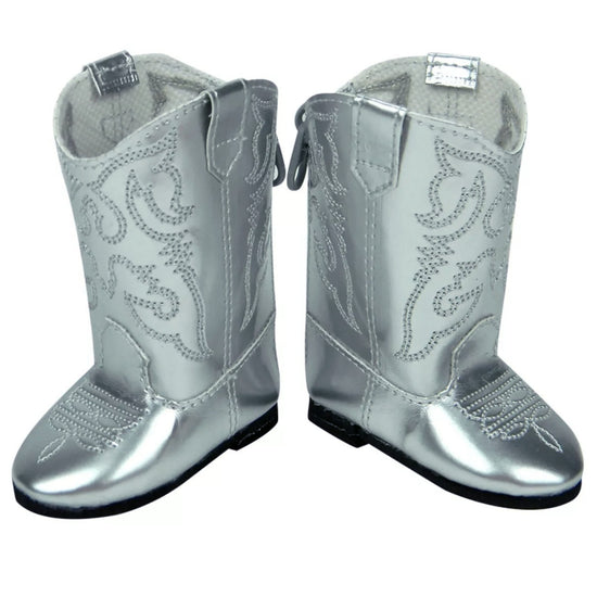 Saddle up for adventure in these shimmering Silver Cowboy Boots! Featuring a bold American Eagle embroidered across the front, these metallic beauties bring Western flair with a sparkly twist. Perfect for doll fashion enthusiasts who love mixing patriotic pride with cowgirl charm. Watch your 18-inch doll strut in style with boots that catch the light and turn heads at every playtime rodeo.