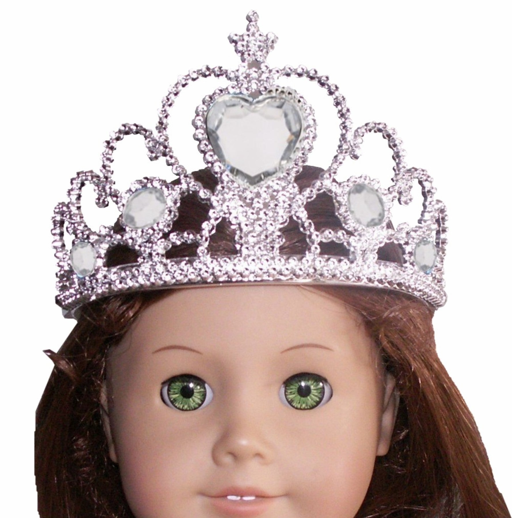 Silver Jeweled Heart Tiara Crown with faux jewels, sized for 18" American Girl dolls and similar-sized companions. Features a charming heart design adorned with sparkling faux jewels that catch the light beautifully. Fits dolls with a head circumference of approximately 12.5". Perfect for adding a touch of royal elegance to your doll's wardrobe, whether for everyday play or special occasions.