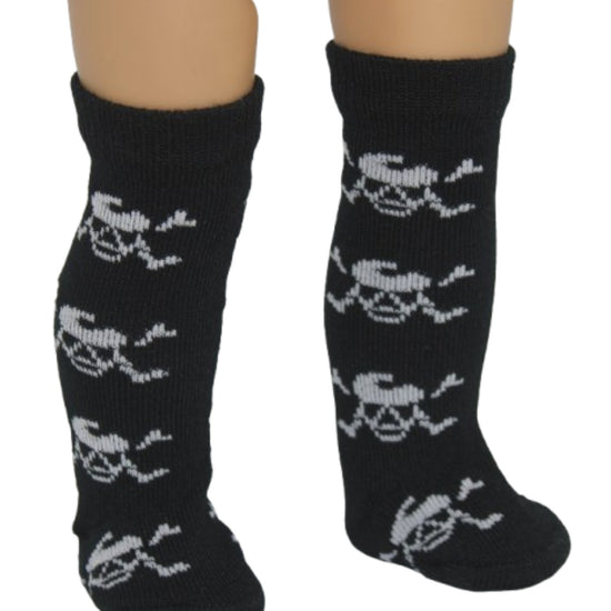 Black skull & crossbones patterned knee high socks fit American Girl sized dolls.