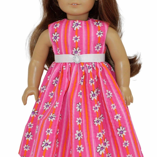 This playful sleeveless dress for American Girl dolls features a fully lined bodice for comfort and a full gathered skirt. The back Velcro closure makes dressing quick and easy, perfect for busy doll adventures. Brighten up playtime with this charming and easy-to-wear outfit!