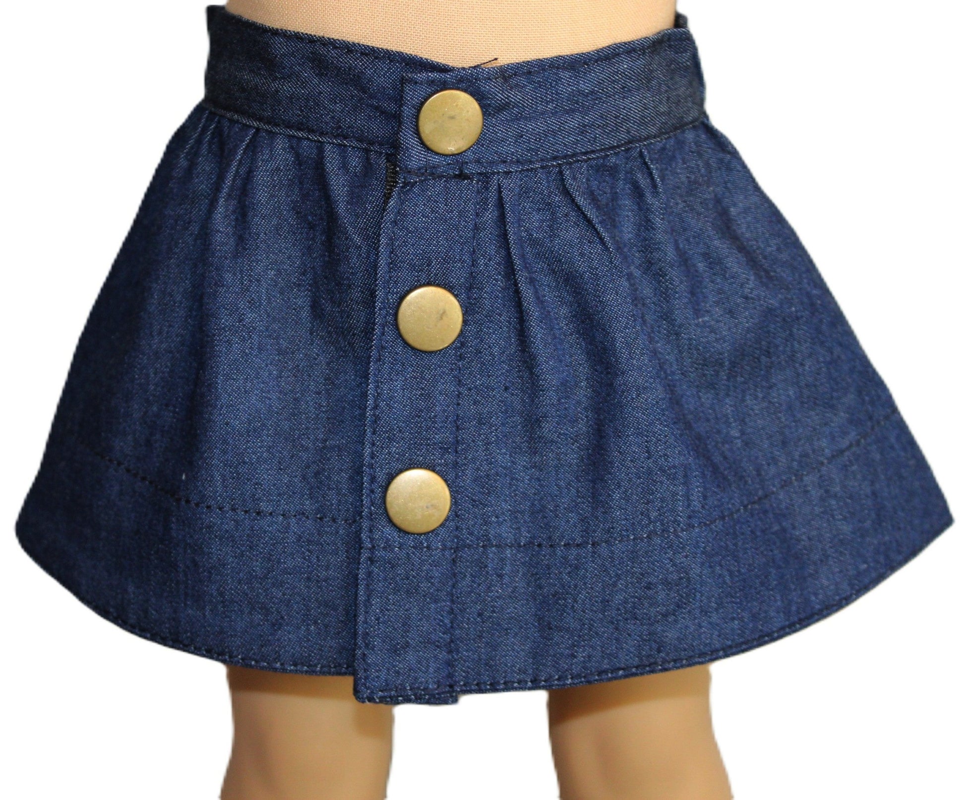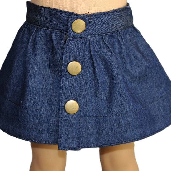 Navy blue denim skirt with slight gathers has a snap and Velcro front closure.