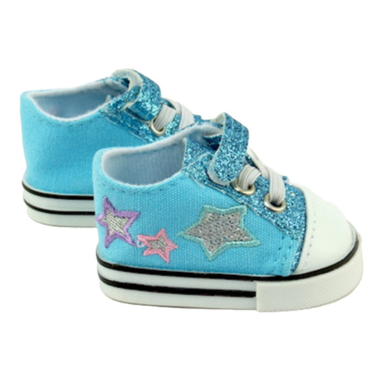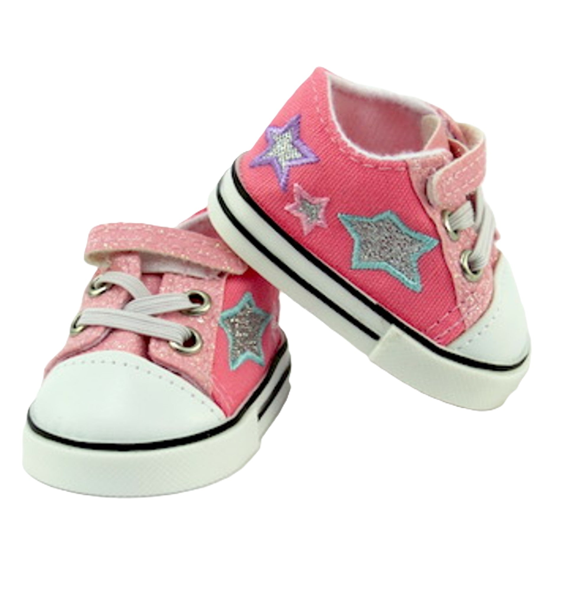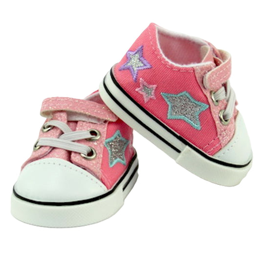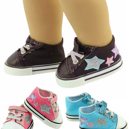 Lace up for adventure with these stellar Star Sparkle Sneakers! Available in bold black, vibrant pink, or cool teal with eye-catching sparkle details, these sneakers are designed to fit 18-inch American Girl dolls. The dual-closure system—elastic laces paired with a secure Velcro strap—makes getting dressed quick and easy, so your doll can spend more time playing. Perfect for active playtime, these comfy kicks bring star power to every outfit!