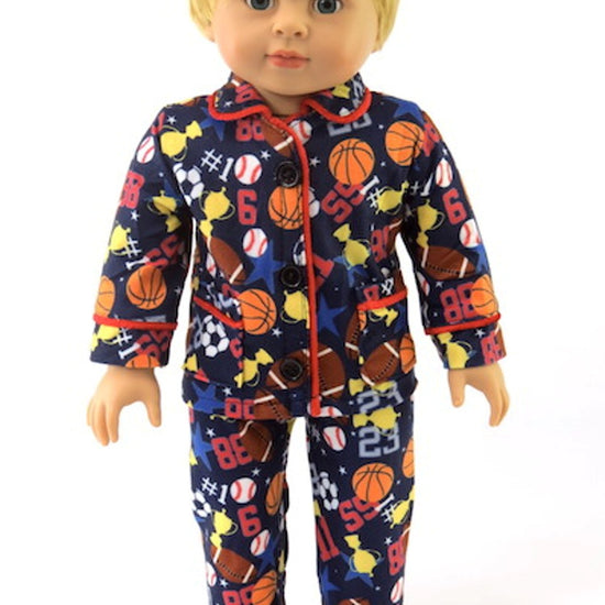 Score big style points with these navy sports-themed pajamas designed for 18" dolls like American Girl and My Generation. Comfortable and playful, they’re perfect for your doll’s game day or cozy nights in!