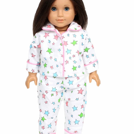 Twirl into dreamland in these charming white flannel pajamas featuring a delightful music and ballerina slippers print. Finished with cheerful blue trim, they're the perfect cozy companion for your 18-inch doll. Soft, warm, and oh-so-sweet—ideal for bedtime stories and imaginative play.