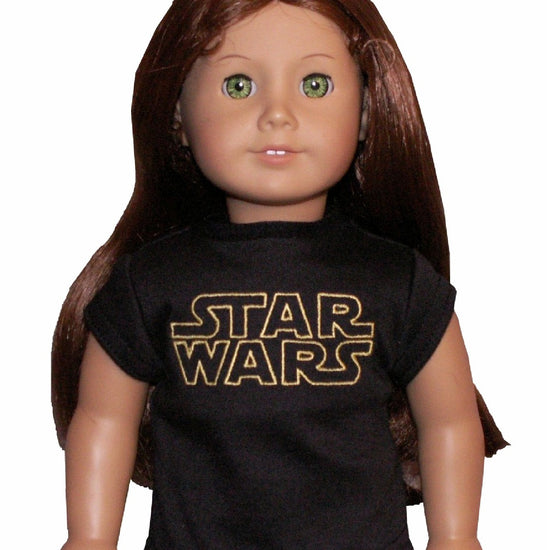 Black fitted tee showcasing epic Star Wars embroidery that brings galactic style to your doll's wardrobe. The full back opening makes dressing your American Girl doll quick and effortless—no fussing with tight sleeves! Perfect for young collectors who want their dolls ready for intergalactic adventures.