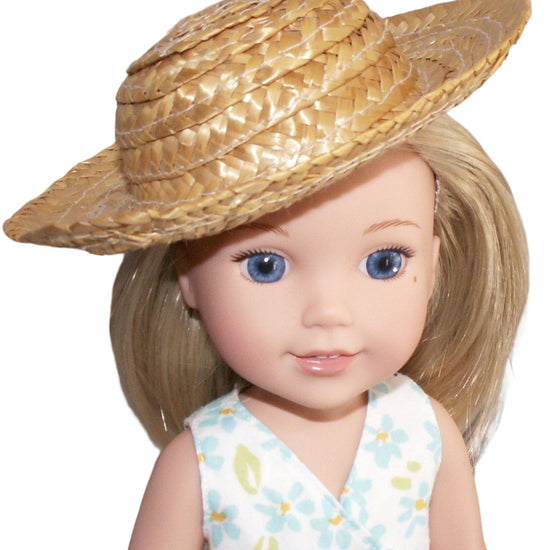 Perfect straw hat accessory for 14" WellieWishers dolls. This charming miniature hat features authentic straw detailing and fits dolls with a 10" head circumference. An ideal addition to any doll wardrobe, whether you're styling outdoor adventures or completing a coordinated outfit. Handcrafted with attention to detail for a premium finishing touch.