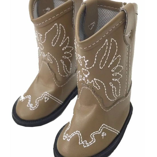Tan doll cowboy boots feature an embroidered American Eagle on the front, adding a classic touch to your doll’s outfit. Designed for a comfortable fit, they bring a Western style perfect for imaginative play.