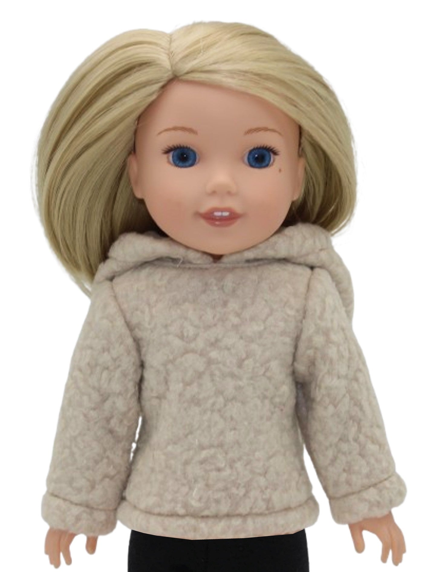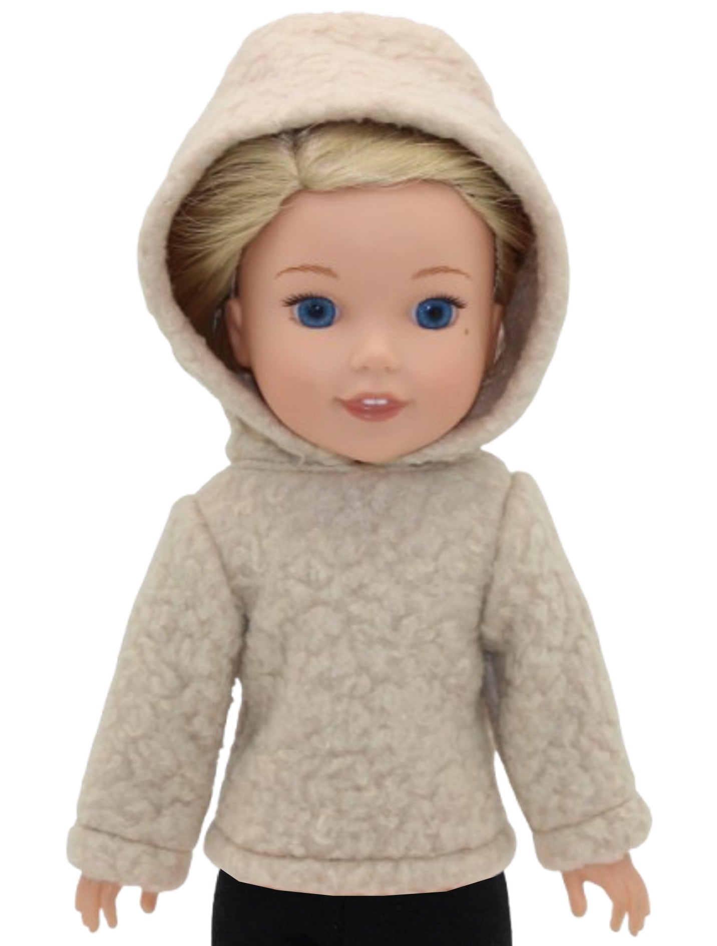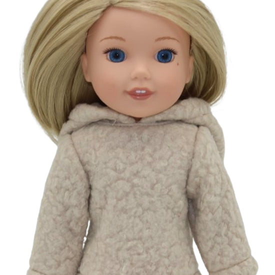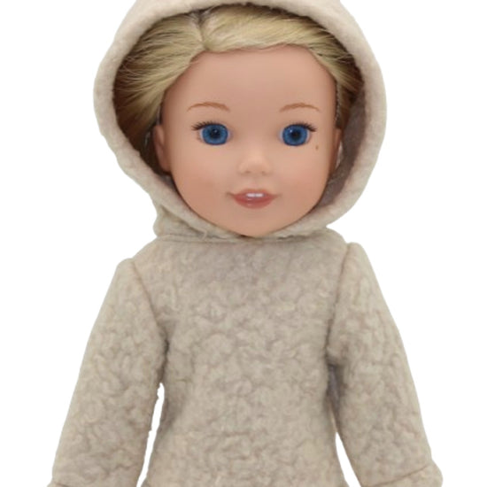 Tan Sherpa style hoodie fully opens in back for easy doll dressing.