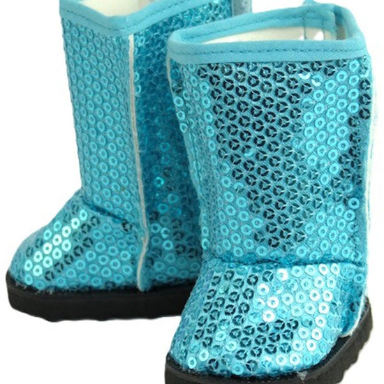 These teal sequin boots add sparkle to any doll outfit. They close securely with Velcro for easy dressing and removal. Perfect for adding fun and shine to your doll's wardrobe.