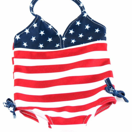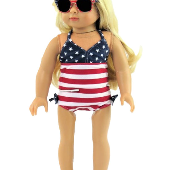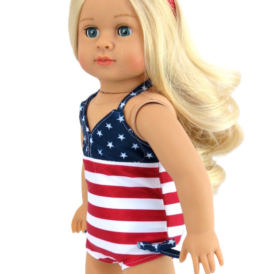 Celebrate summer in style with this adorable red, white, and blue one-piece swimsuit for your American Girl doll. Perfect for showing off a patriotic spirit, this cute bathing suit adds a splash of fun to any sunny day adventure.