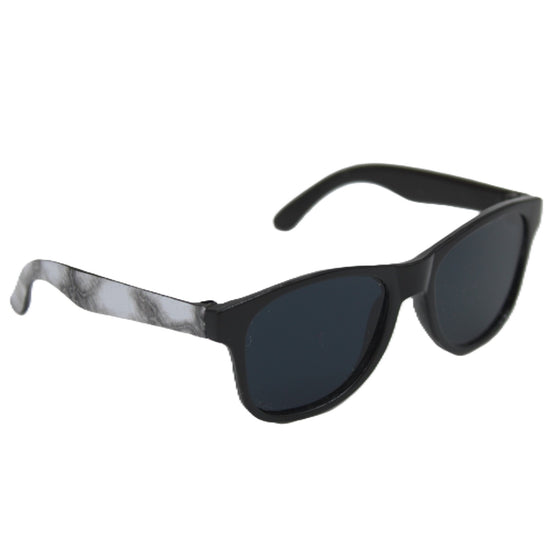 Black wayfarer style plastic frame sunglasses with white marble sides.