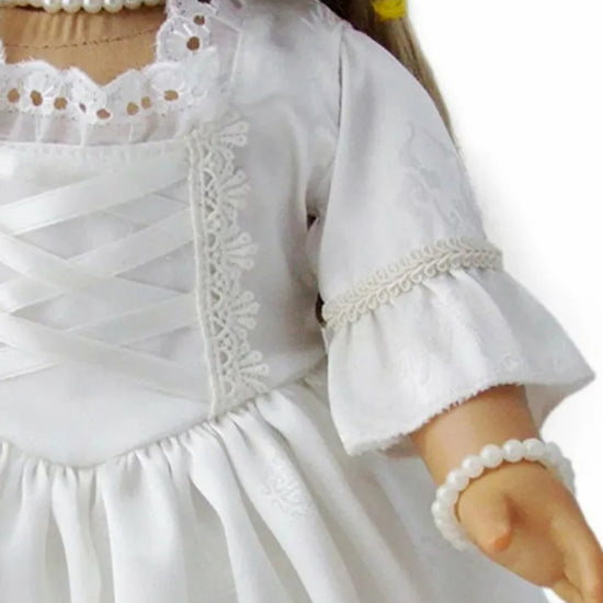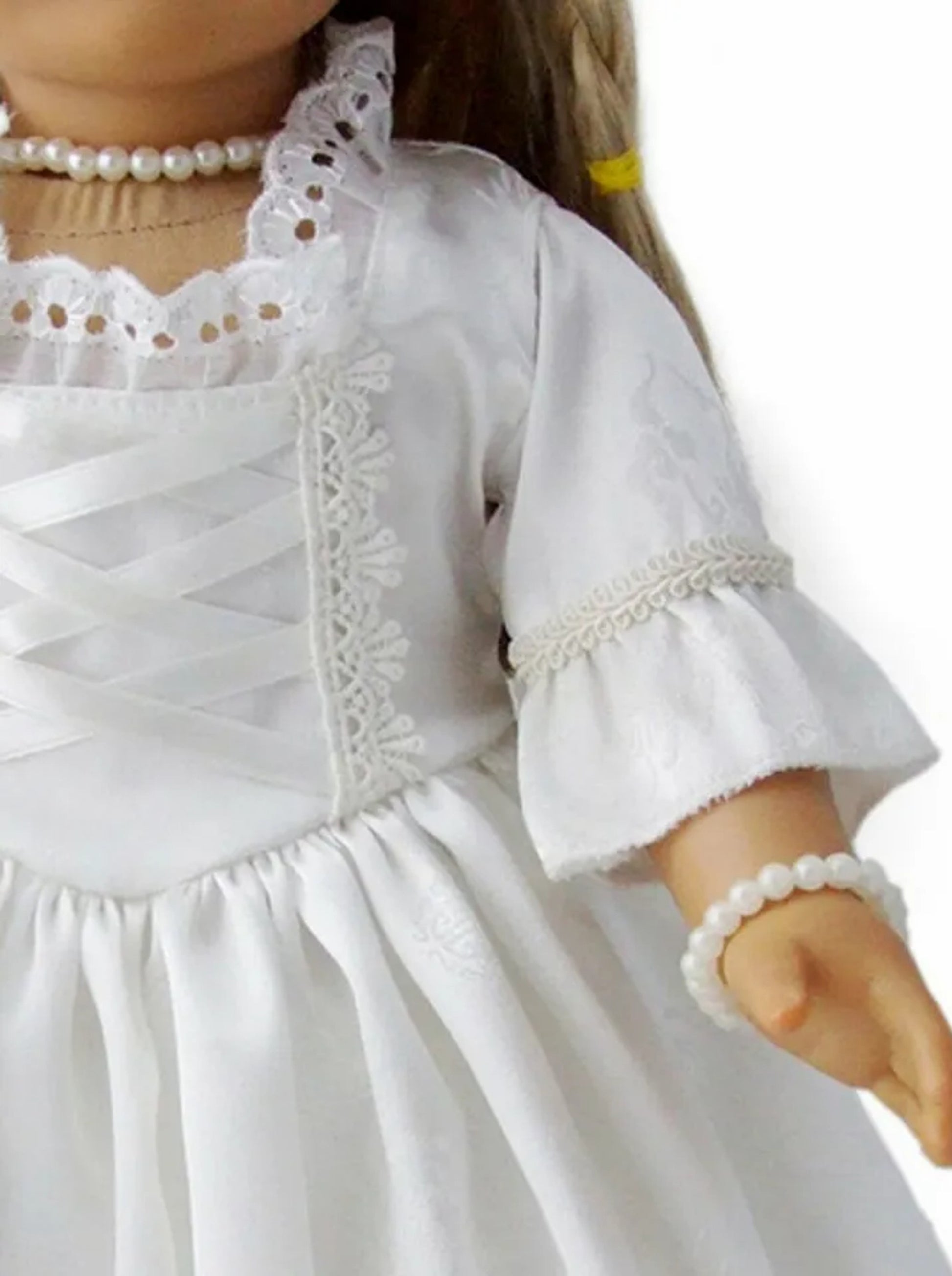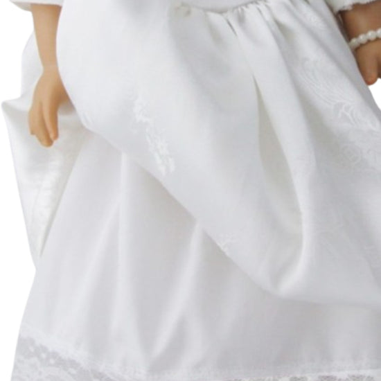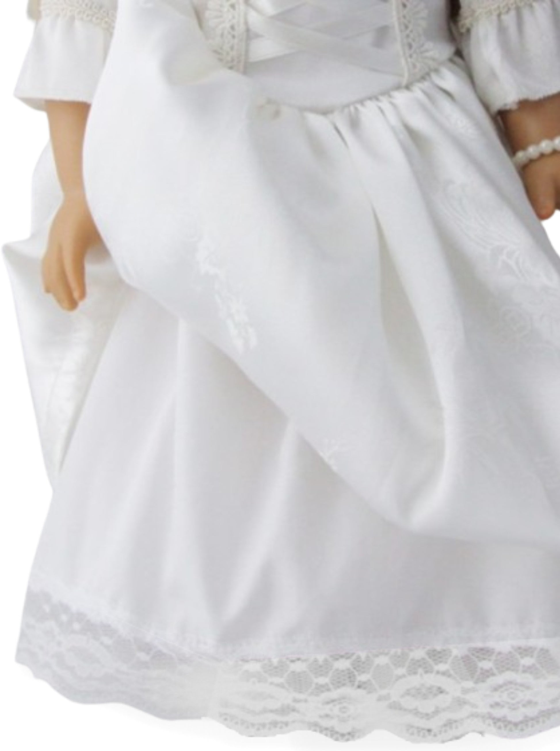 Gorgeous white jacquard wedding dress with ribbon and lace work at front bodice.