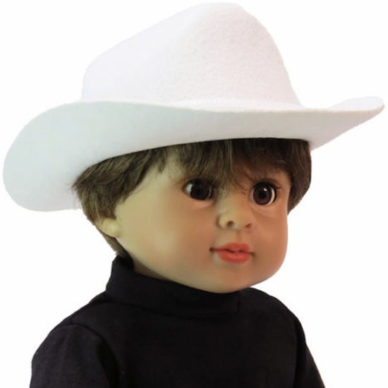 Bring a fresh twist to your 18" American Girl doll’s wardrobe with this playful white felt cowboy hat! Measuring approximately 7 1/2" by 7" by 2 3/4", its stiff felt shape keeps your doll ready for any western adventure. Designed for a 12" head circumference, this hat adds a bright, bold flair to every outfit.