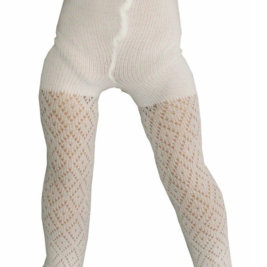 These white diamond pattern knit tights are designed specifically for American Girl dolls. Their delicate fabric offers a stylish look but is best suited for gentle handling, making them ideal for older children or collectors.