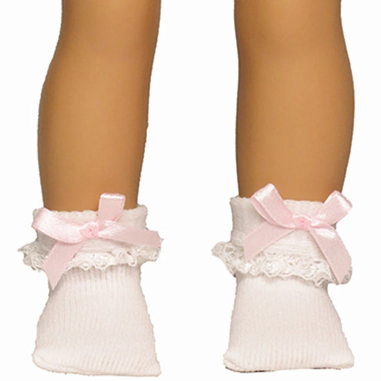 Dress up those doll feet with adorable white lace anklets and pink bows! These charming socks feature delicate lace trim that adds a touch of elegance to any outfit. Designed to fit most dolls ranging from 15" to 22" with average-sized feet, they're versatile enough for your entire doll collection. Perfect for completing casual looks, fancy ensembles, or anything in between—these little details make all the difference in doll fashion!