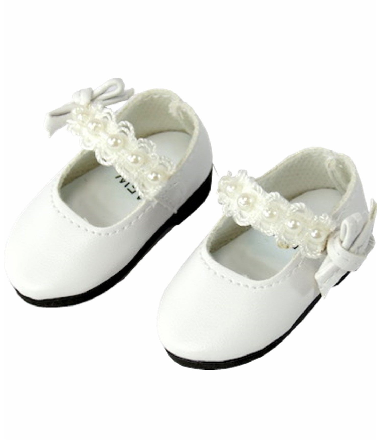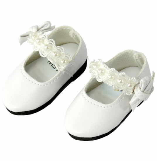 White Mary Jane style dress shoes with pearl accents.