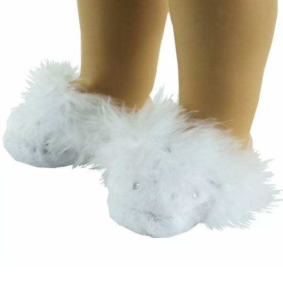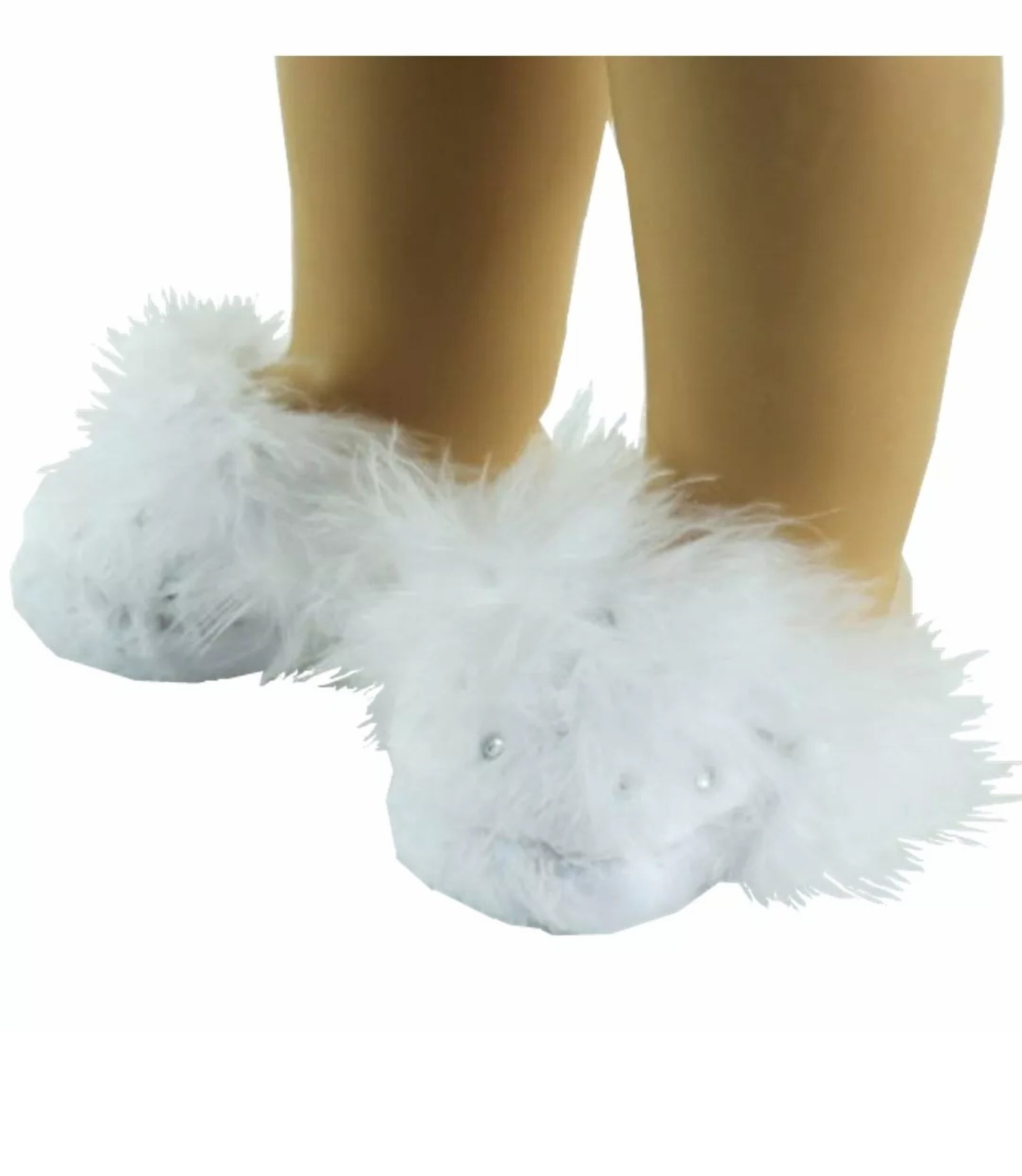 Treat your American Girl doll to cozy fun with these white furry slippers, sparkling with rhinestone accents. Soft and fluffy, they bring a playful touch of glam to your doll’s lounging look while fitting perfectly for all-day comfort and style.