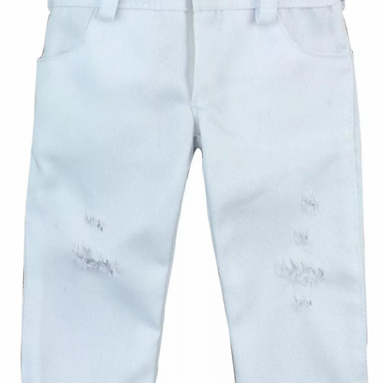 These white lightweight jeans are perfect for dressing up your 18" American Girl doll with trendy style! Featuring classic ripped knees for that cool, casual look, they're made from soft, breathable fabric that's comfortable for all-day doll adventures. Whether your doll is heading to the mall, school, or just hanging out with friends, these jeans add the perfect touch of modern flair to any outfit.