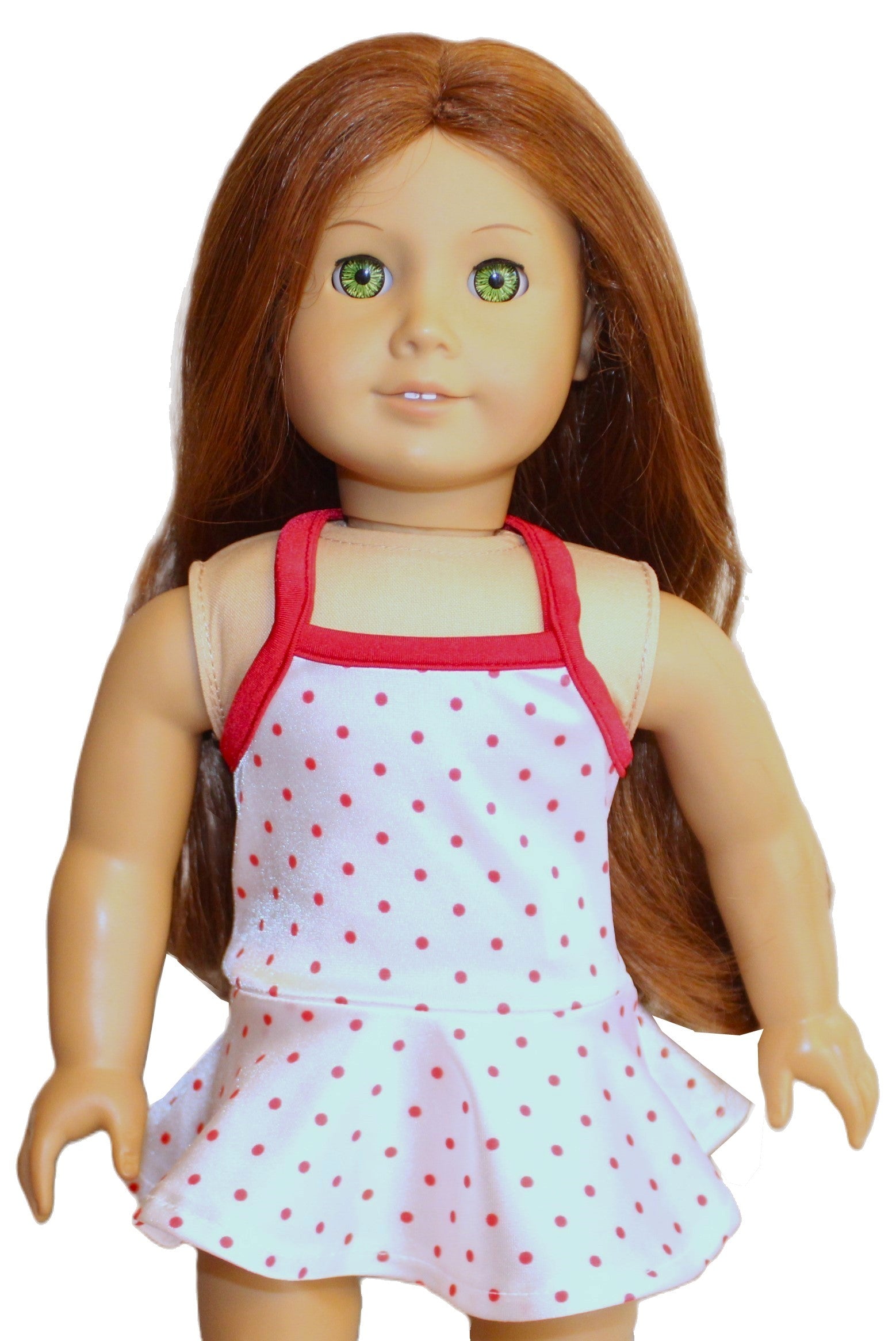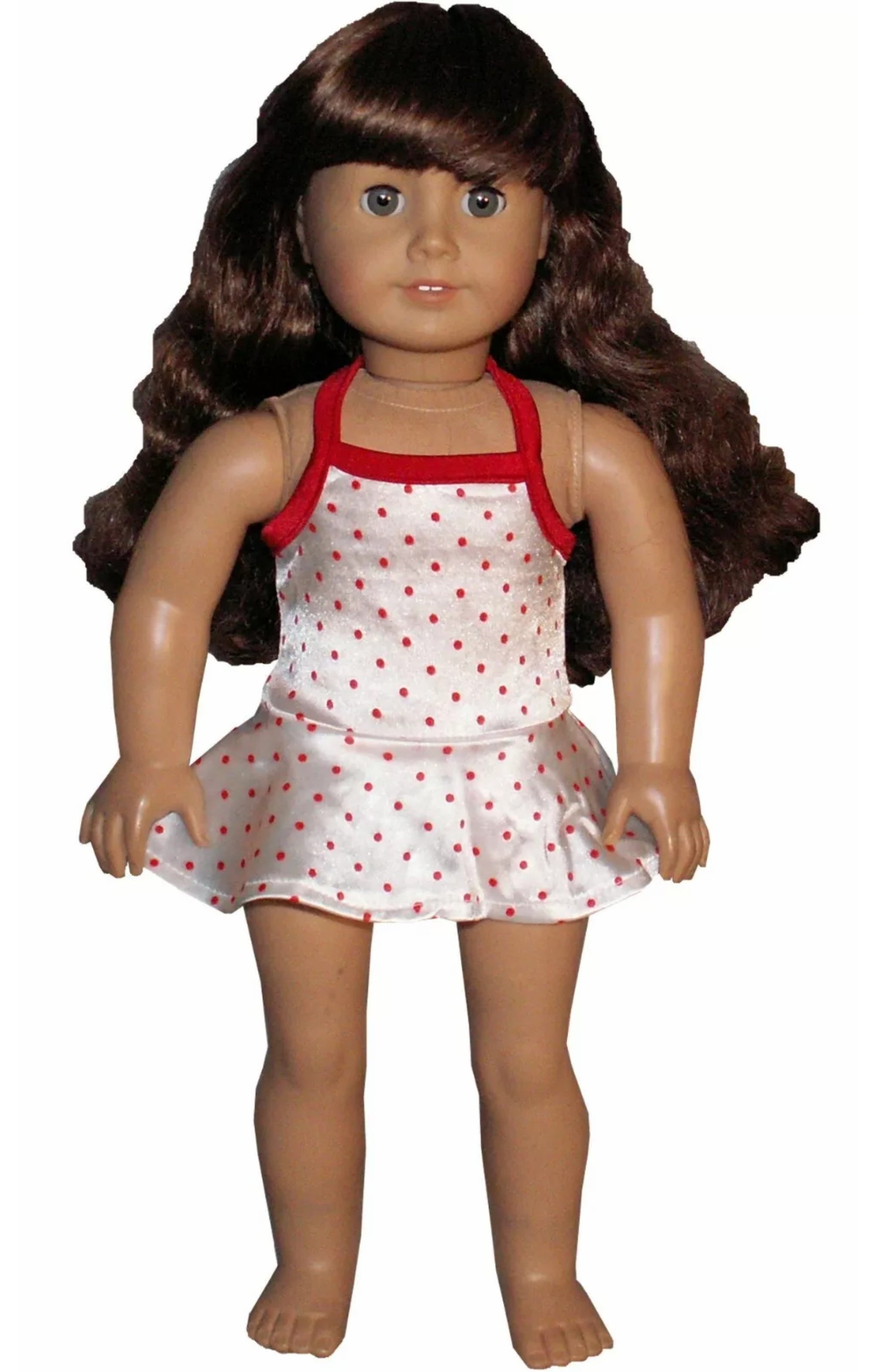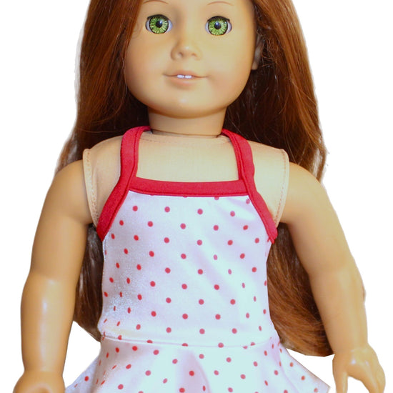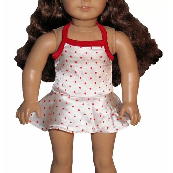 Make a splash with this playful white one-piece halter swimsuit, adorned with fun red polka dots. Designed for American Girl dolls, it features an attached panty for a perfect fit and effortless style—ideal for sunny beach days or poolside adventures.