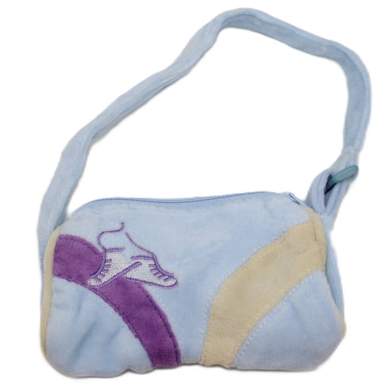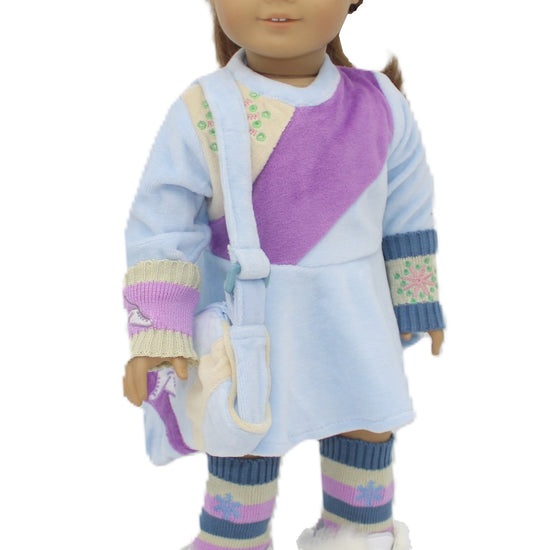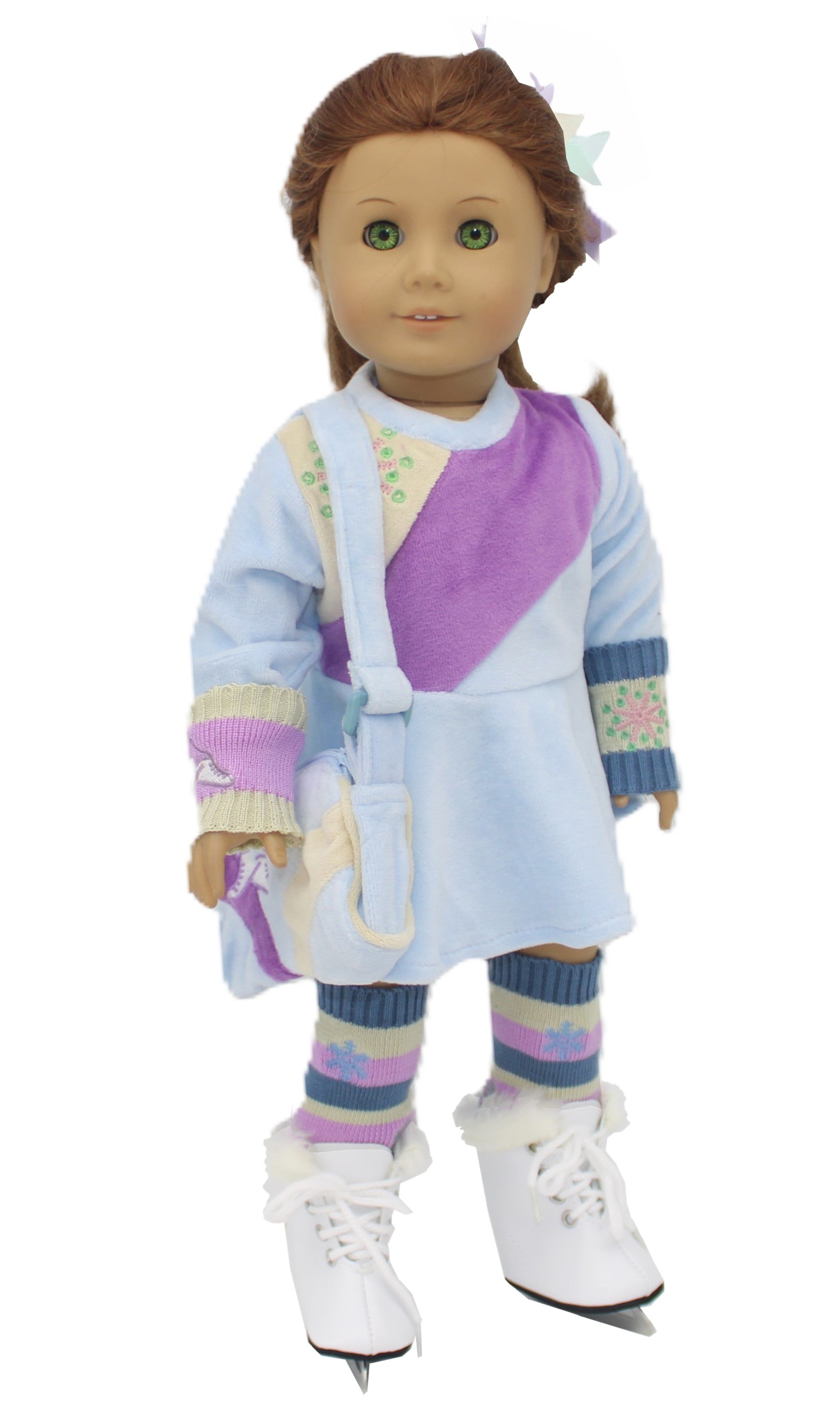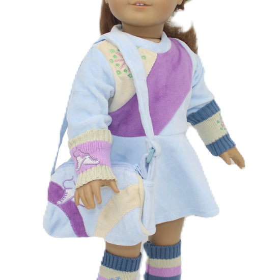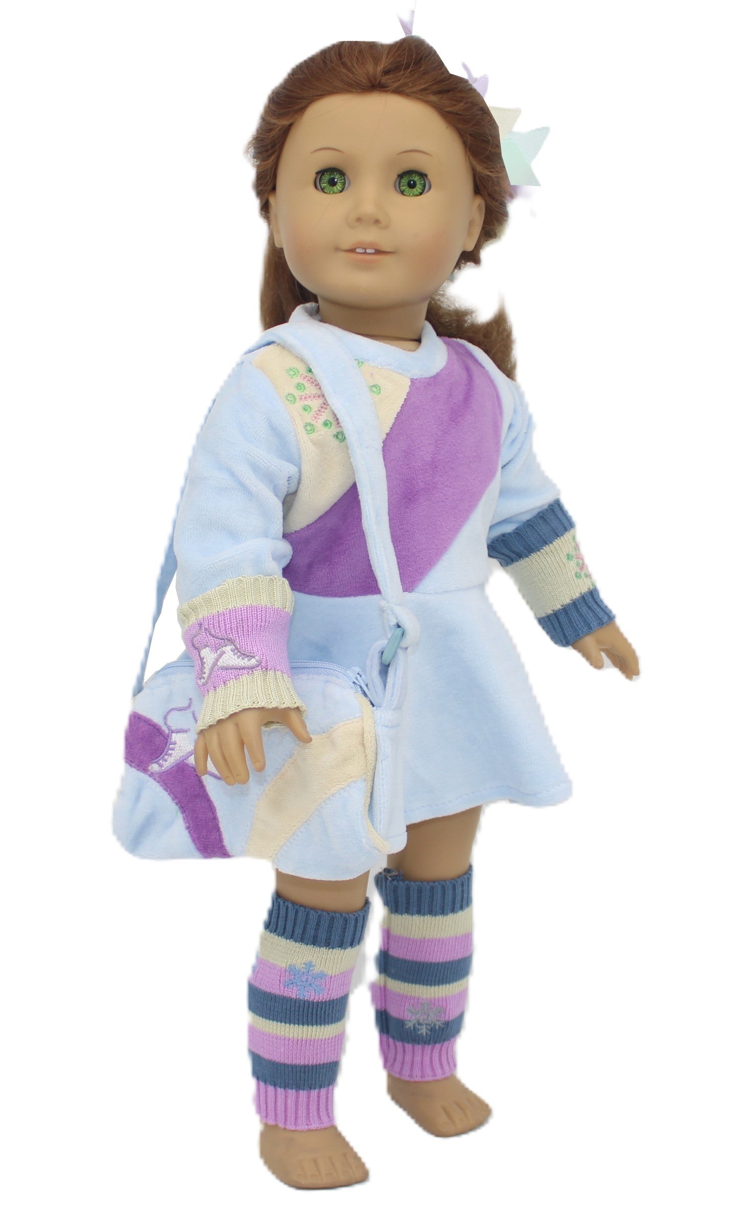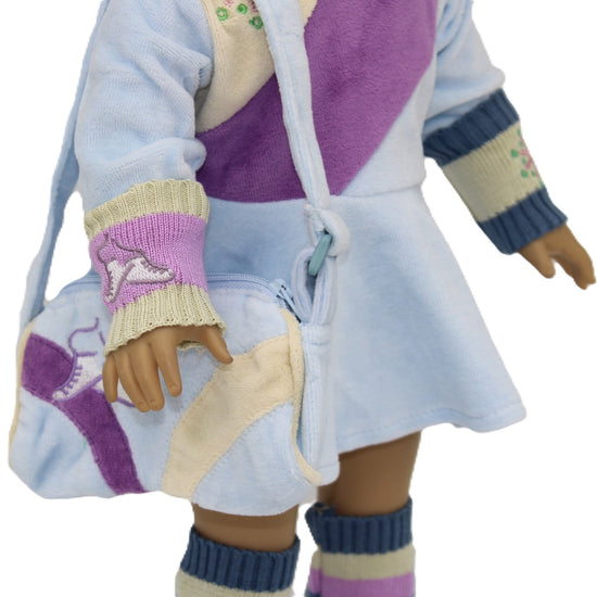 Light blue velour skating outfit with stripe leg warmers, wrist warmers, a hair ribbon ponytail holder and matching sports bag.