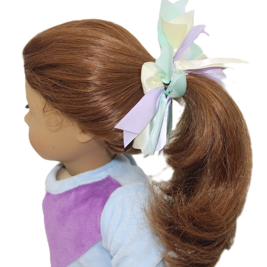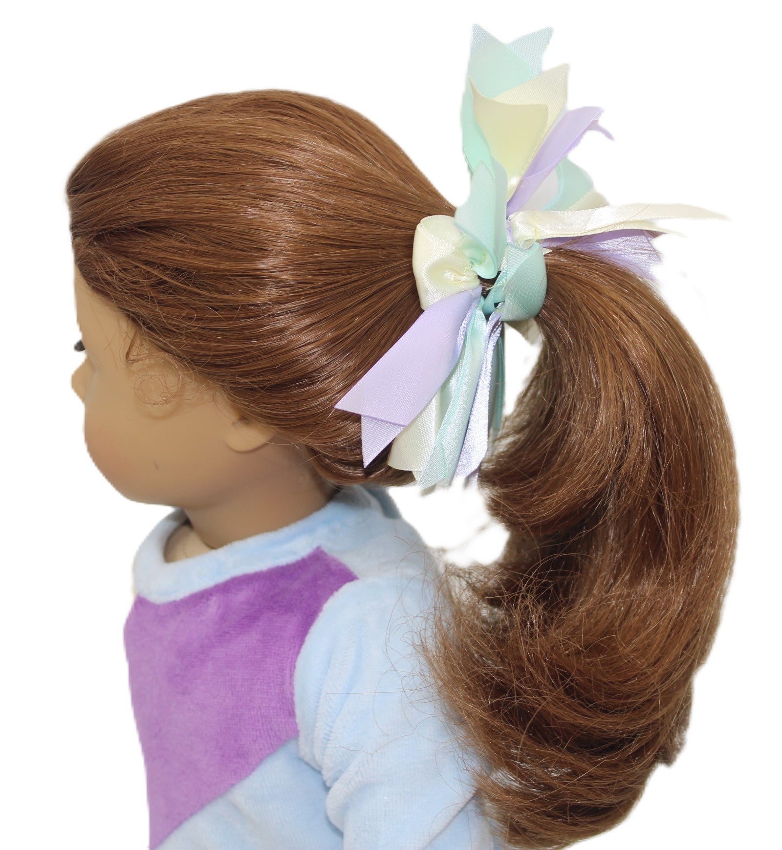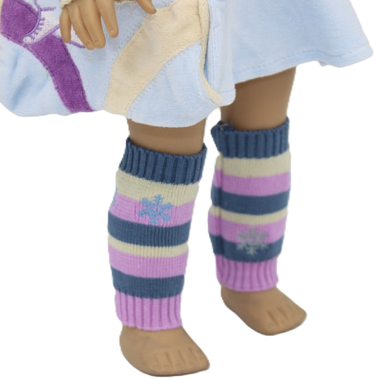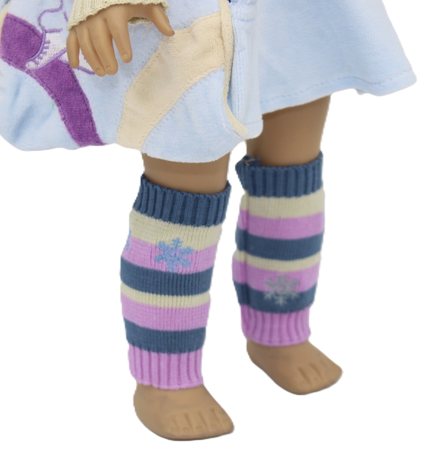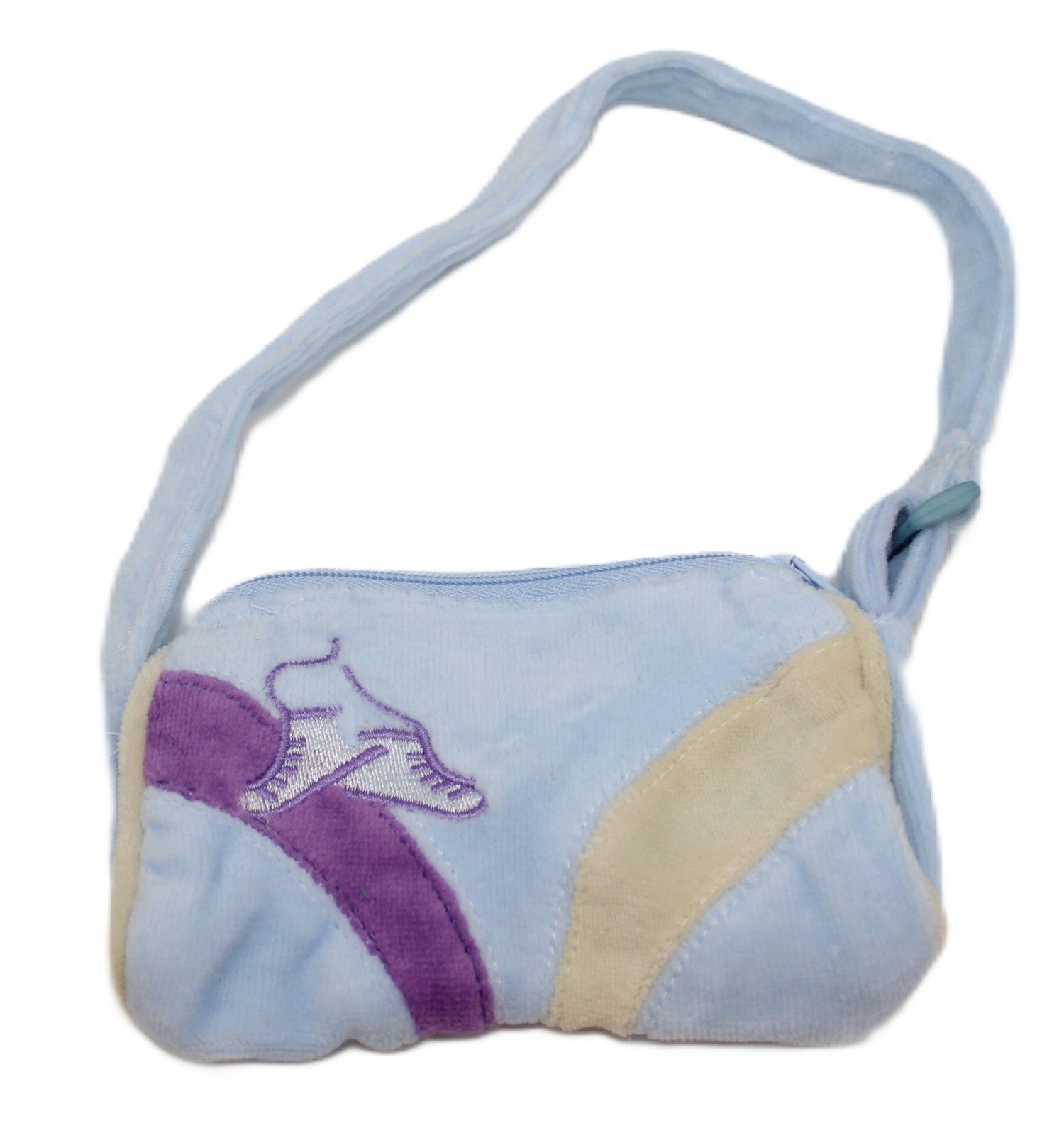 Light blue velour skating outfit with stripe leg warmers, wrist warmers, a hair ribbon ponytail holder and matching sports bag.
