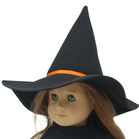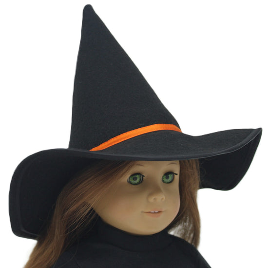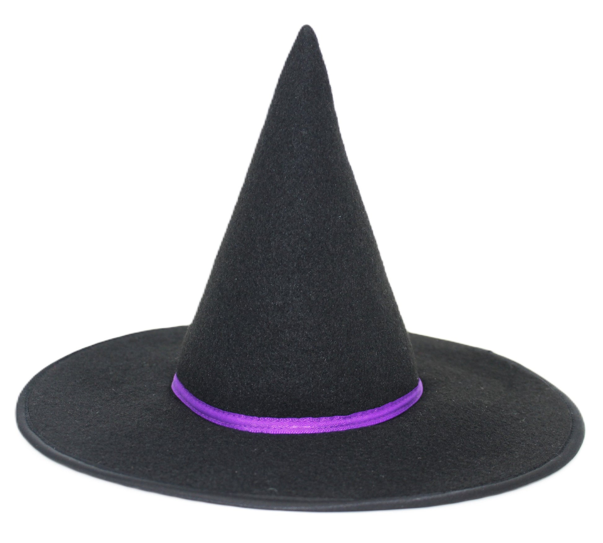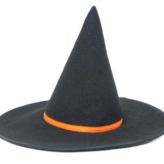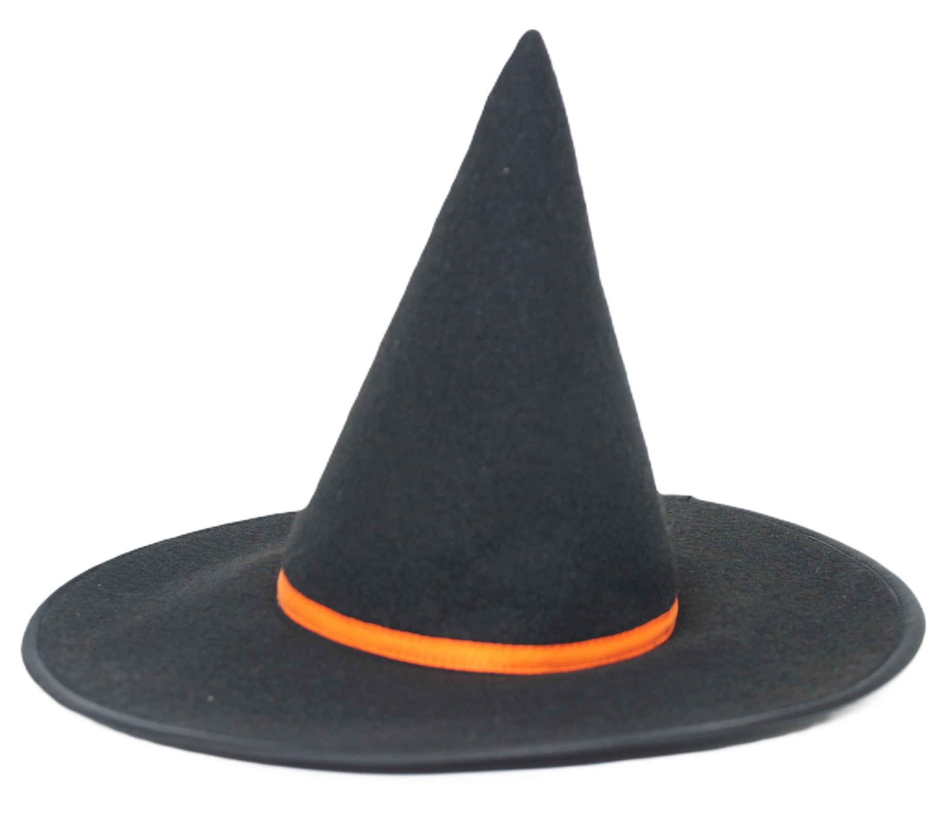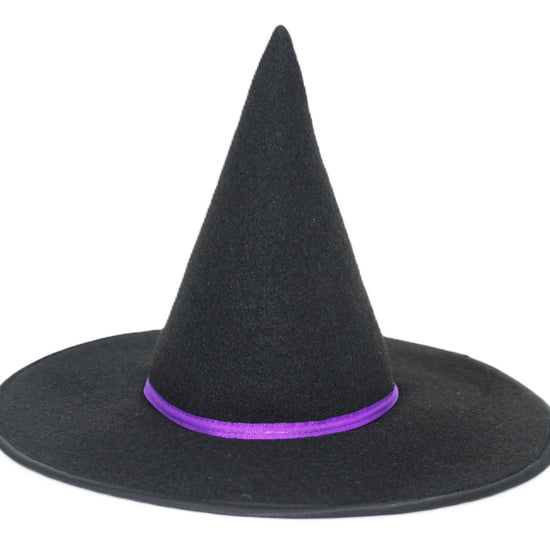 Black witch hat with a ribbon accent. Hat measures 6 1/4" tall and has a 2 1/2" brim.