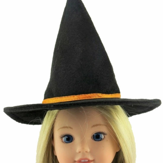 Add a spooky touch to your 14" WellieWishers doll with this playful witch hat! Measuring about 6 1/2" wide by 5" tall, it features a bright orange ribbon that pops against the classic black shape. Designed to fit dolls with a 10" head circumference, this hat is perfect for casting fun Halloween spells.