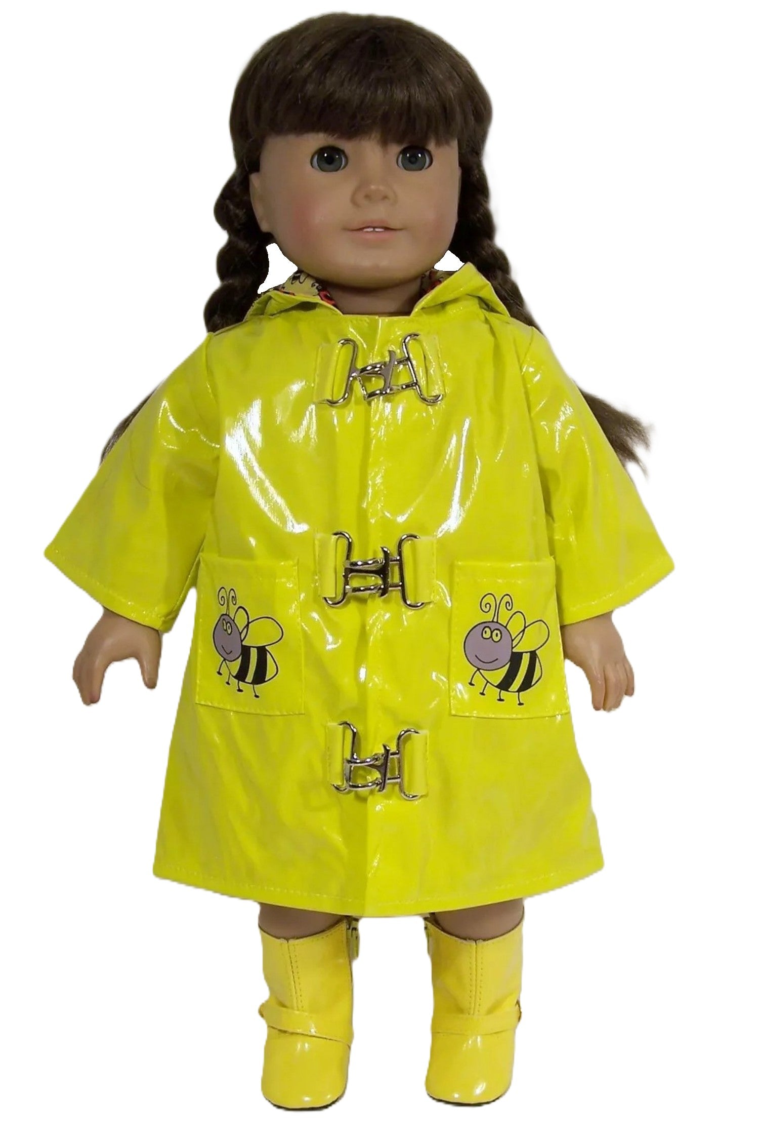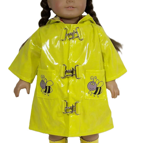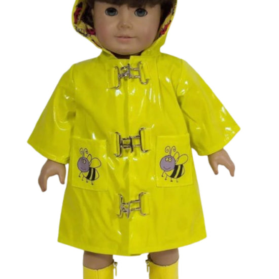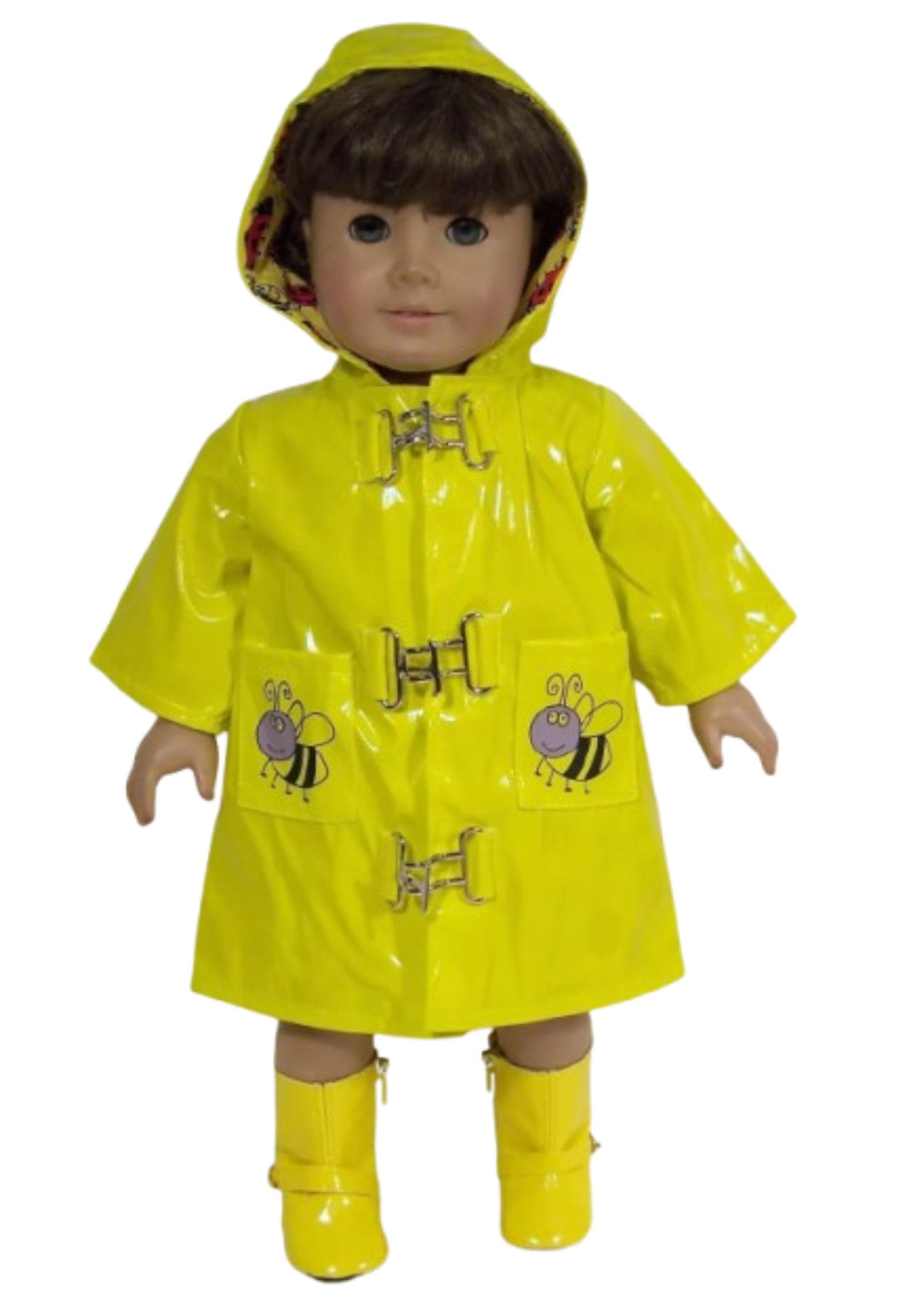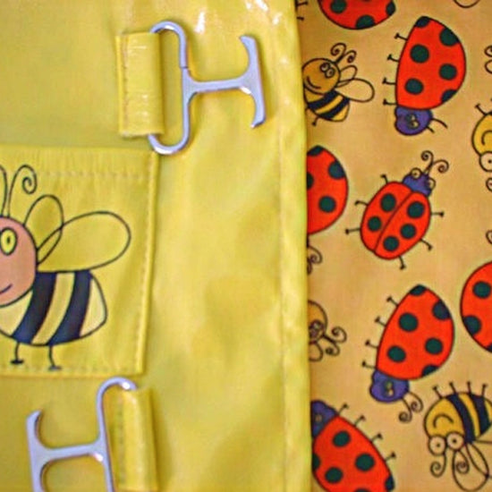 Hooded yellow raincoat with bees on front pockets is lined with a ladybug & bee print.