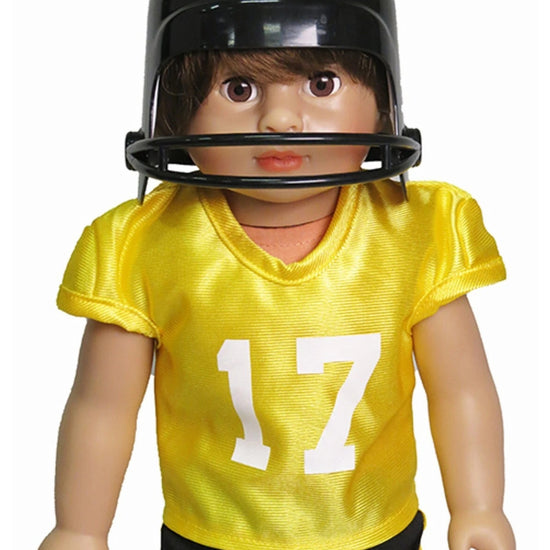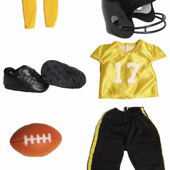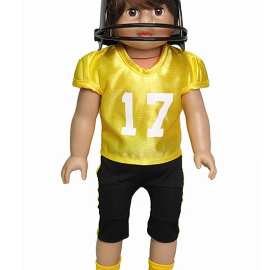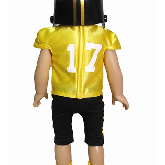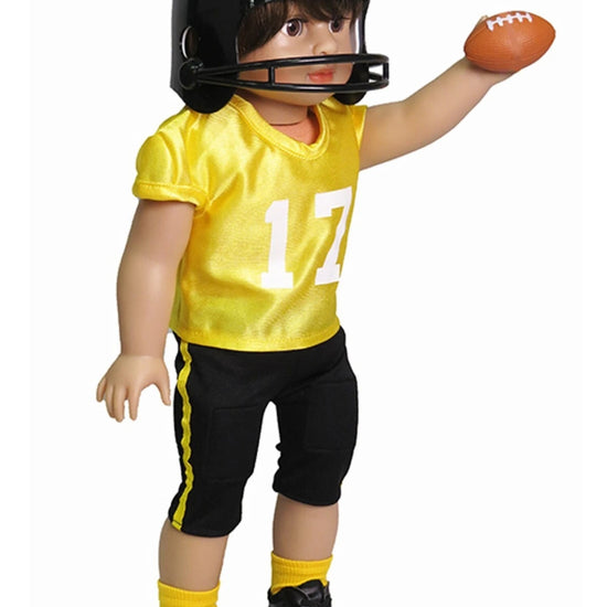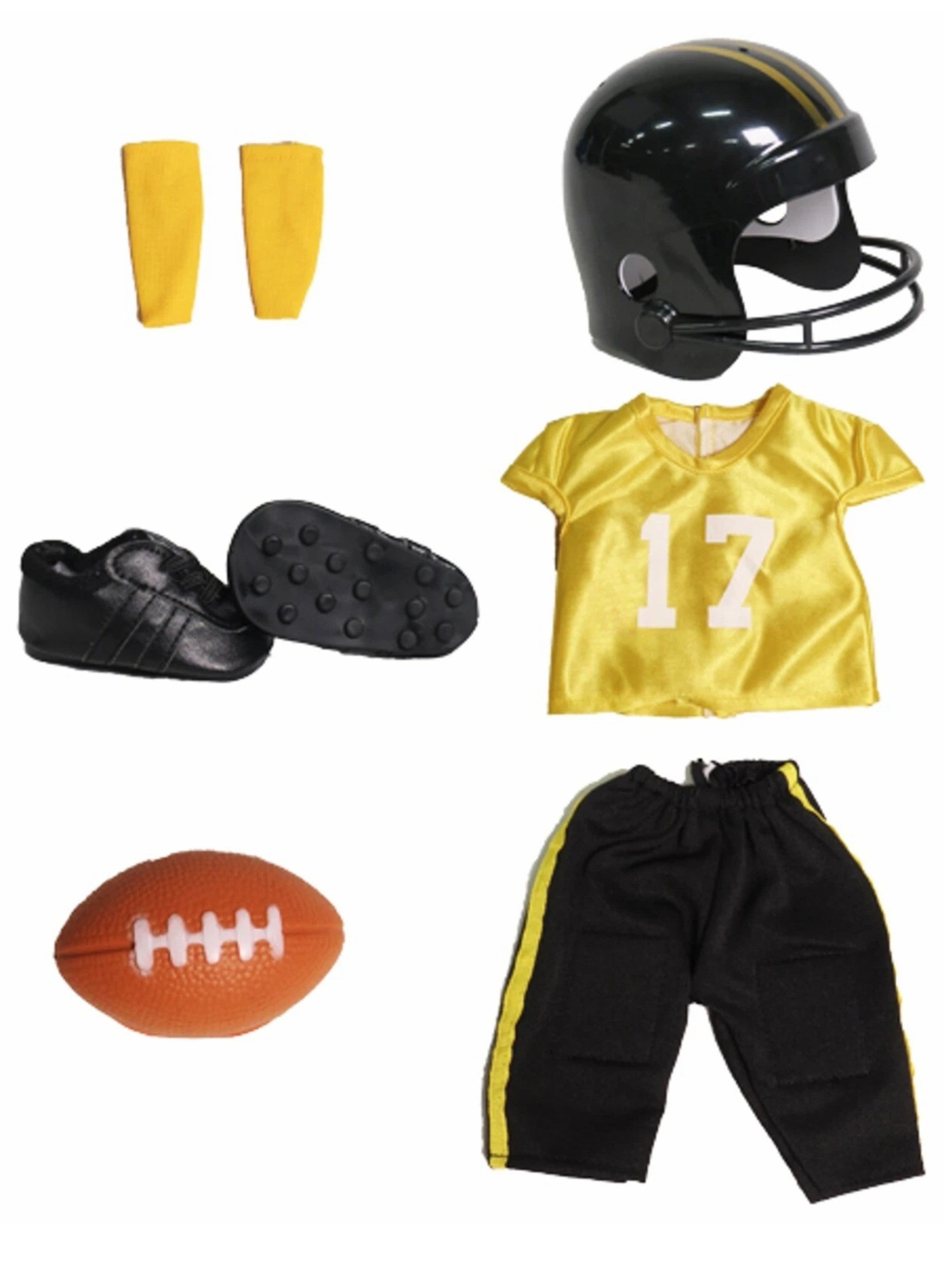 Yellow & black football uniform sized to fit 18" American Girl sized dolls. Set includes jersey, pants (with knee pads), socks, cleats, football and a helmet.