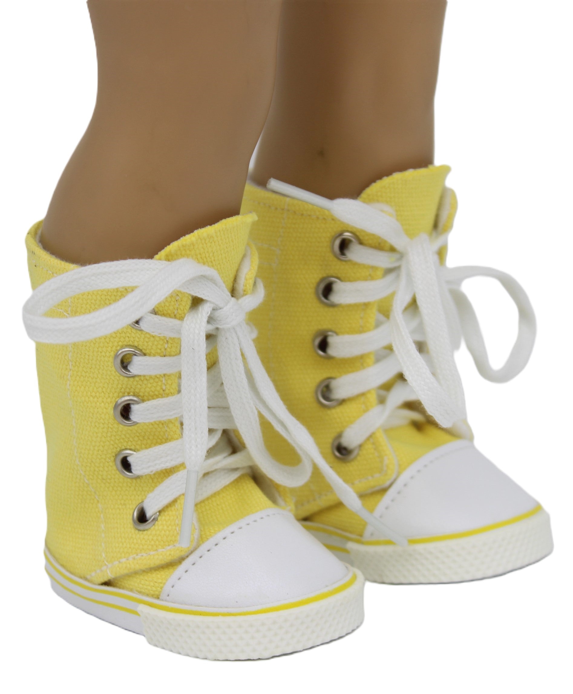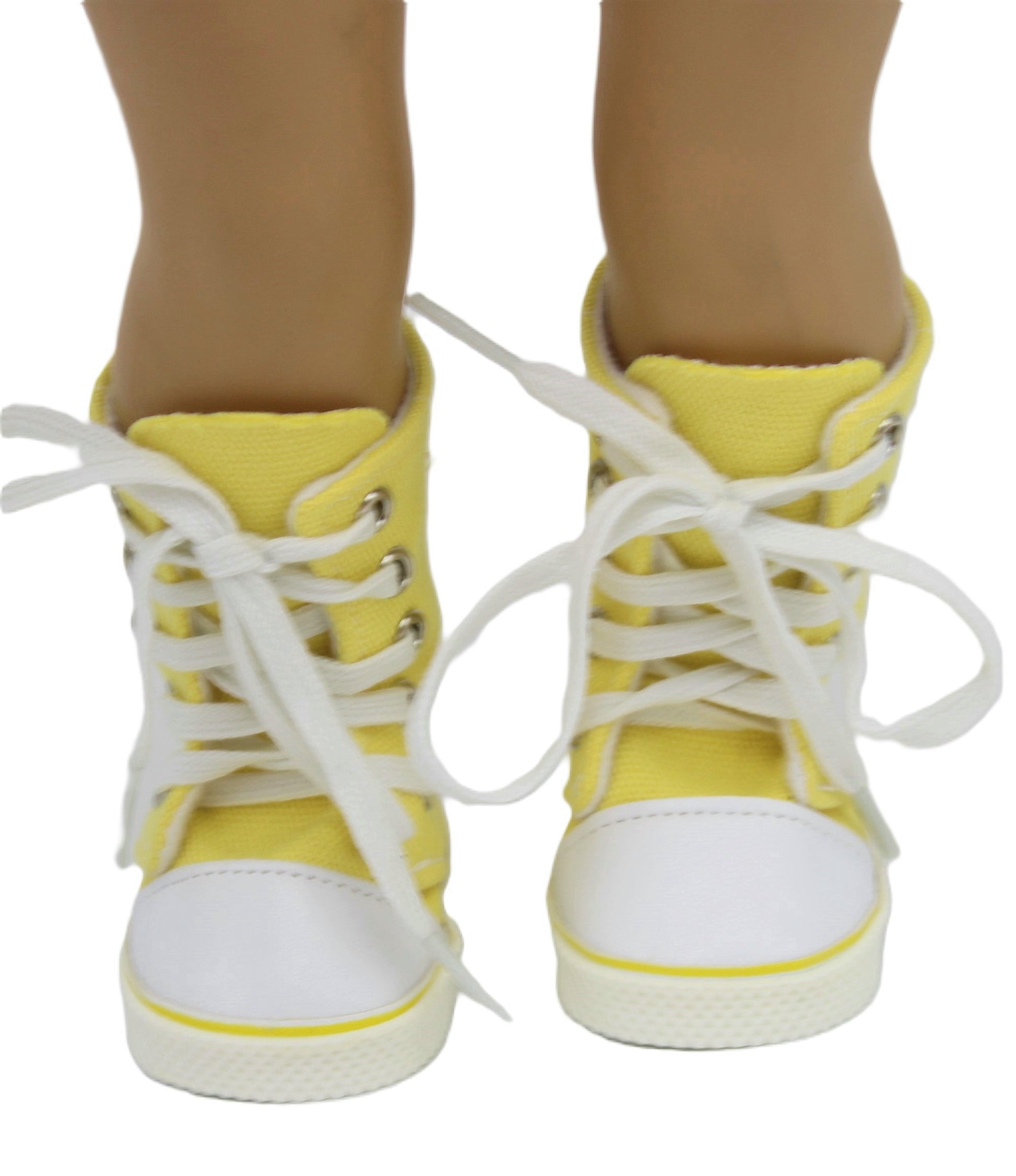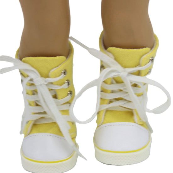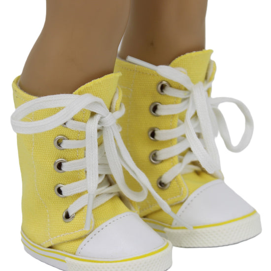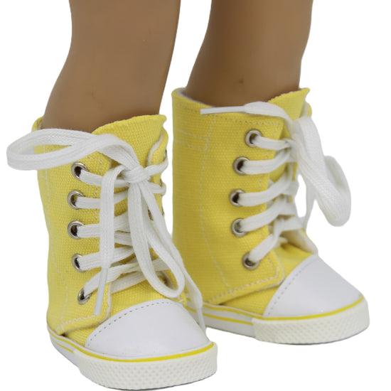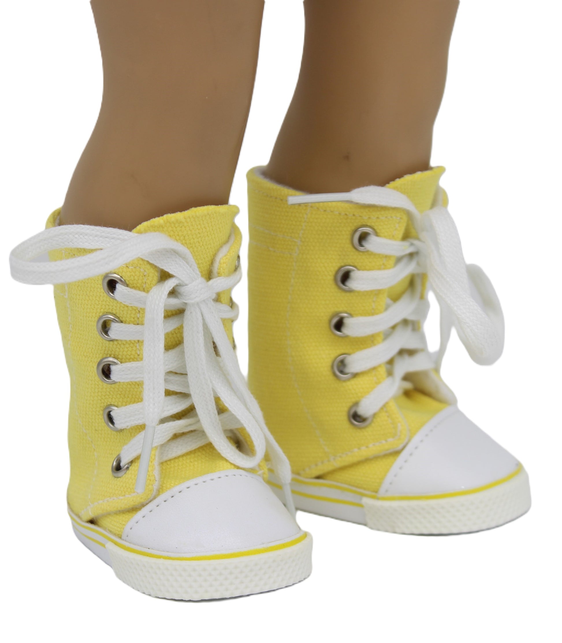 Step up your doll’s style with these bright yellow canvas high-top sneakers! Perfect for adding a pop of color and a fun, sporty vibe. Durable and adorable, they’re a must-have for playful doll wardrobes.