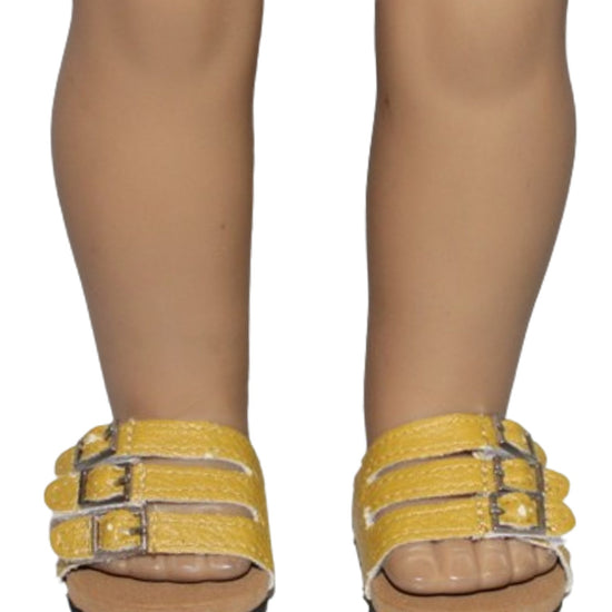 Step into adventure with these yellow tan Euro sandals designed for 18" American Girl size dolls! These authentic-looking sandals feature soft, natural buckskin material that brings rustic elegance to any outfit. Perfect for outdoor adventures or casual everyday wear, they're the ideal finishing touch for your doll's wardrobe. Let your doll explore in style and comfort!